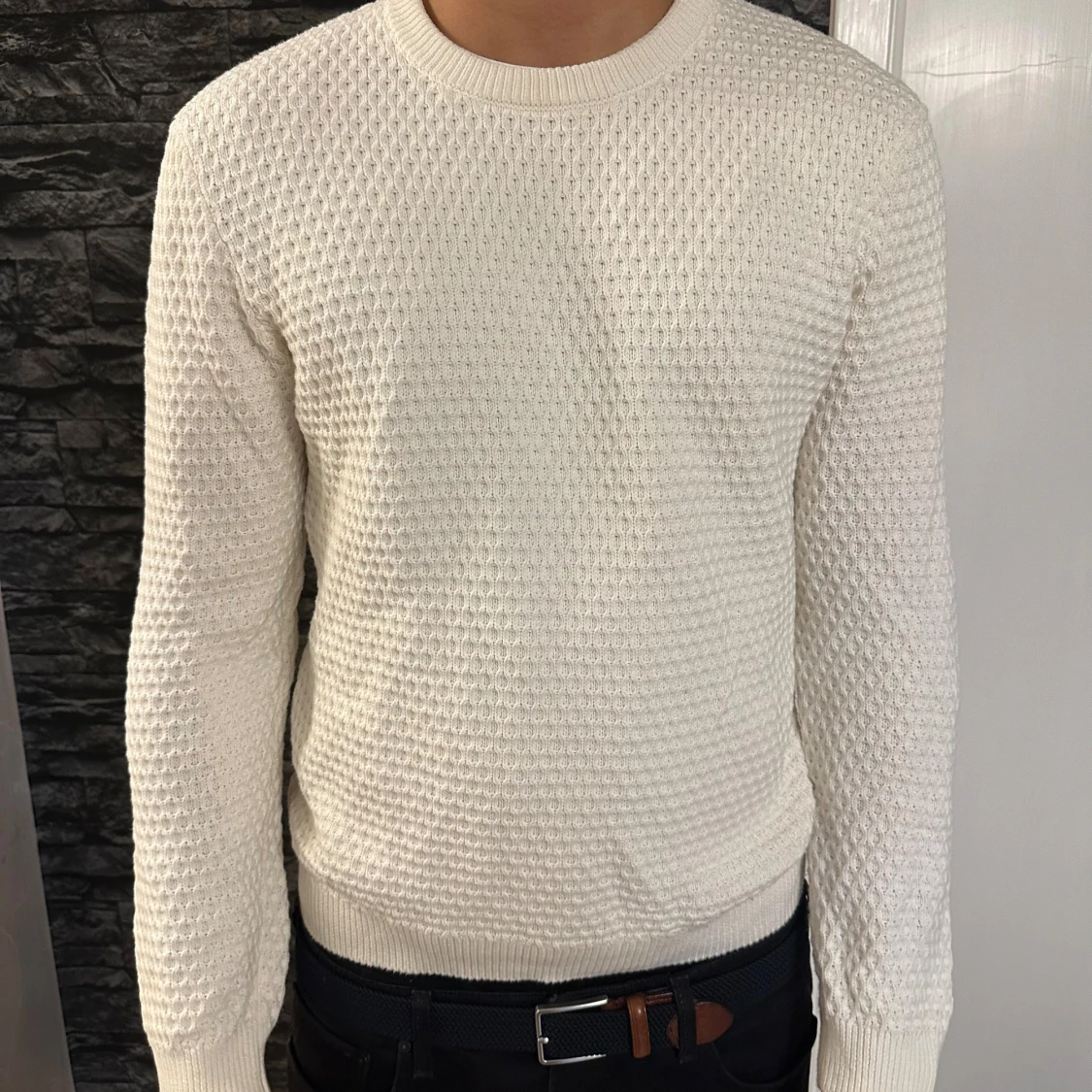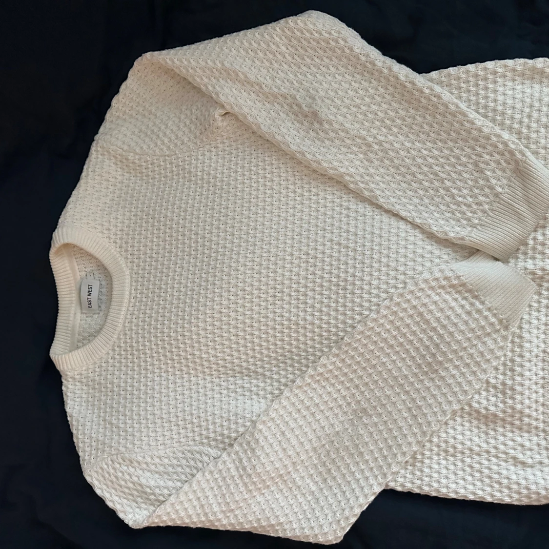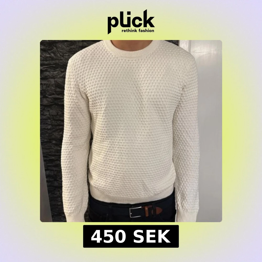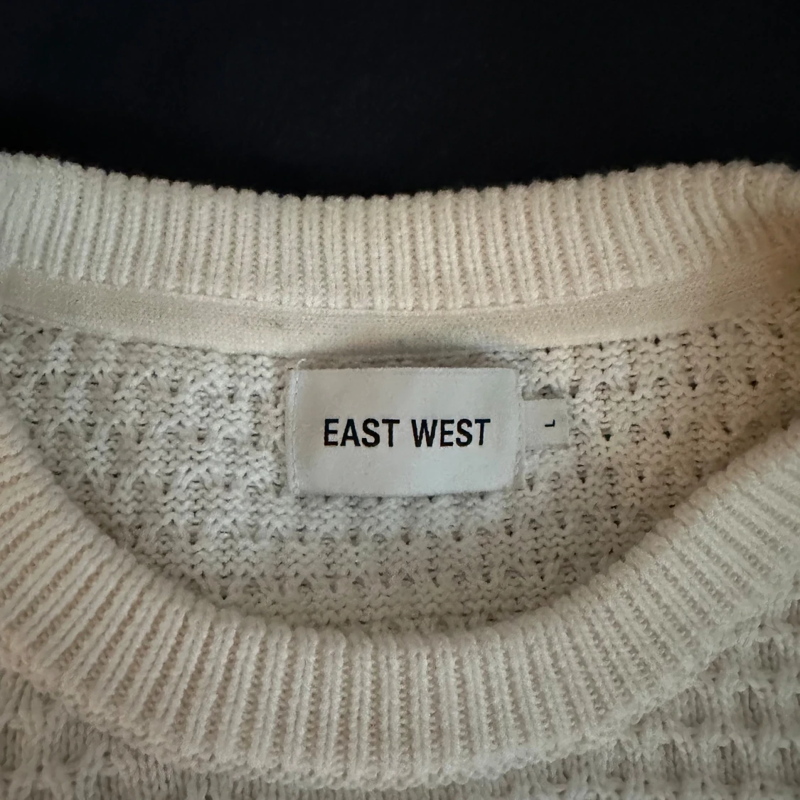 Säljer en vit stickad tröja från East West med snyggt strukturerat mönster. Tröjan har rund halsringning, ribbade muddar och lång ärm. Köpt på Åhléns, nypris 800kr