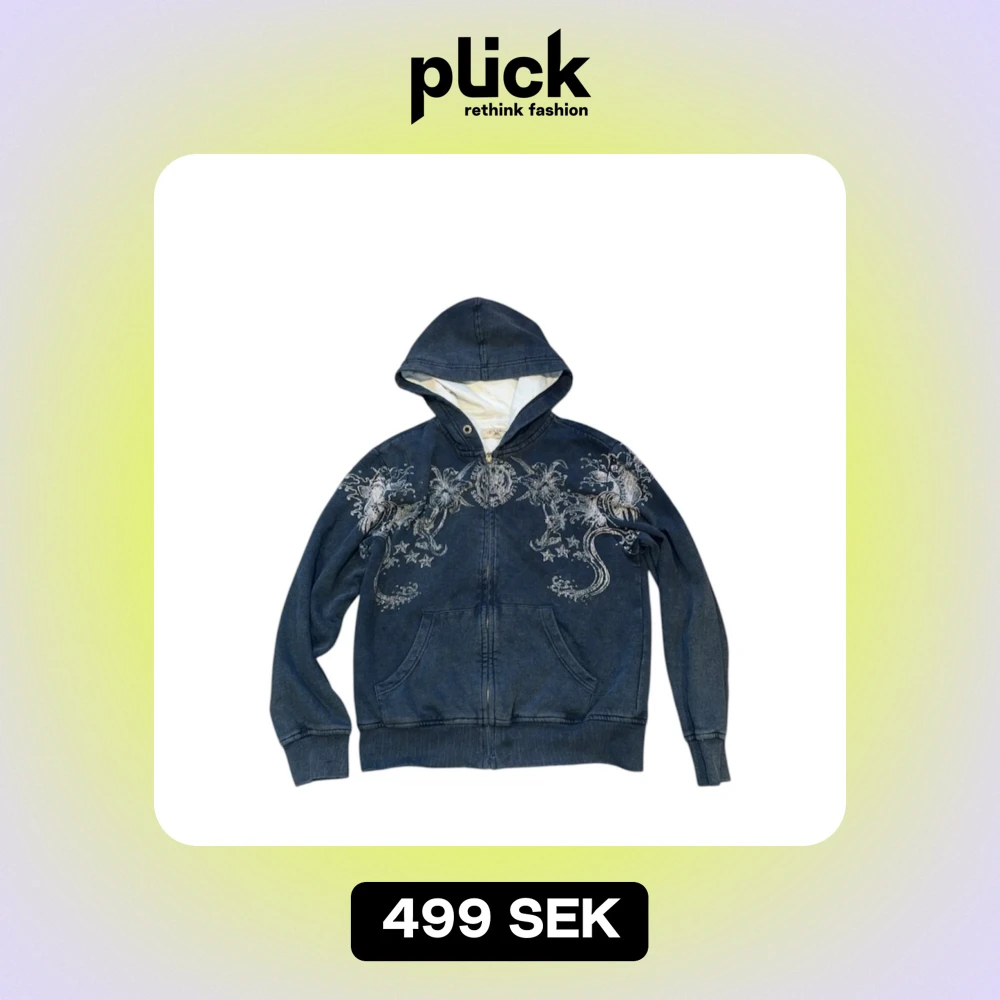 Ed Hardy hoodie med dragkedja och drakmotiv på framsidan. Baksidan har en stor dödskalle med text och detaljerade mönster. Perfekt för en avslappnad stil med en edgy touch. Passar bra till höst och vår.