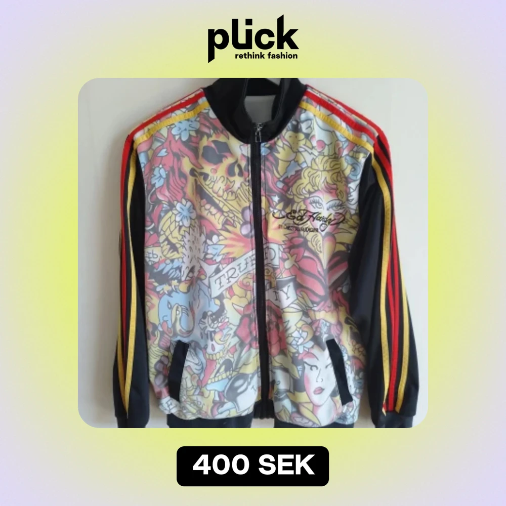 Tröja i track-modell frön Ed Hardy. Storleken är L men är liten i storleken. Skicket är begagnad men bra. Har lite skav på dragkedja och en söm som gått upp vid vänster ficka (lätt fixat om man vill).