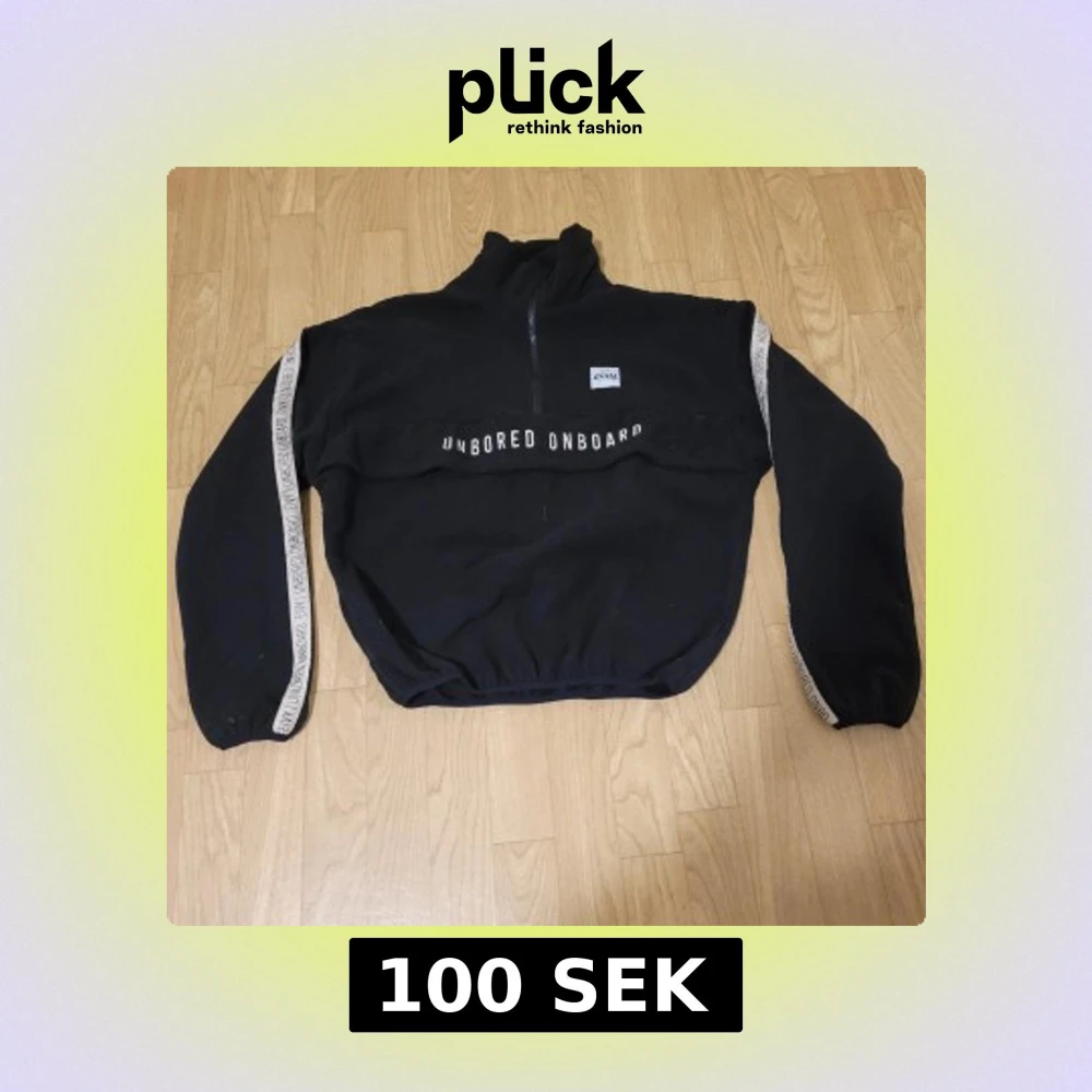 Säljer en svart tröja från Eivy med texten 'UNBORED ONBOARD' på bröstet och längs ärmarna. Tröjan har en halv dragkedja och är perfekt för en avslappnad stil.