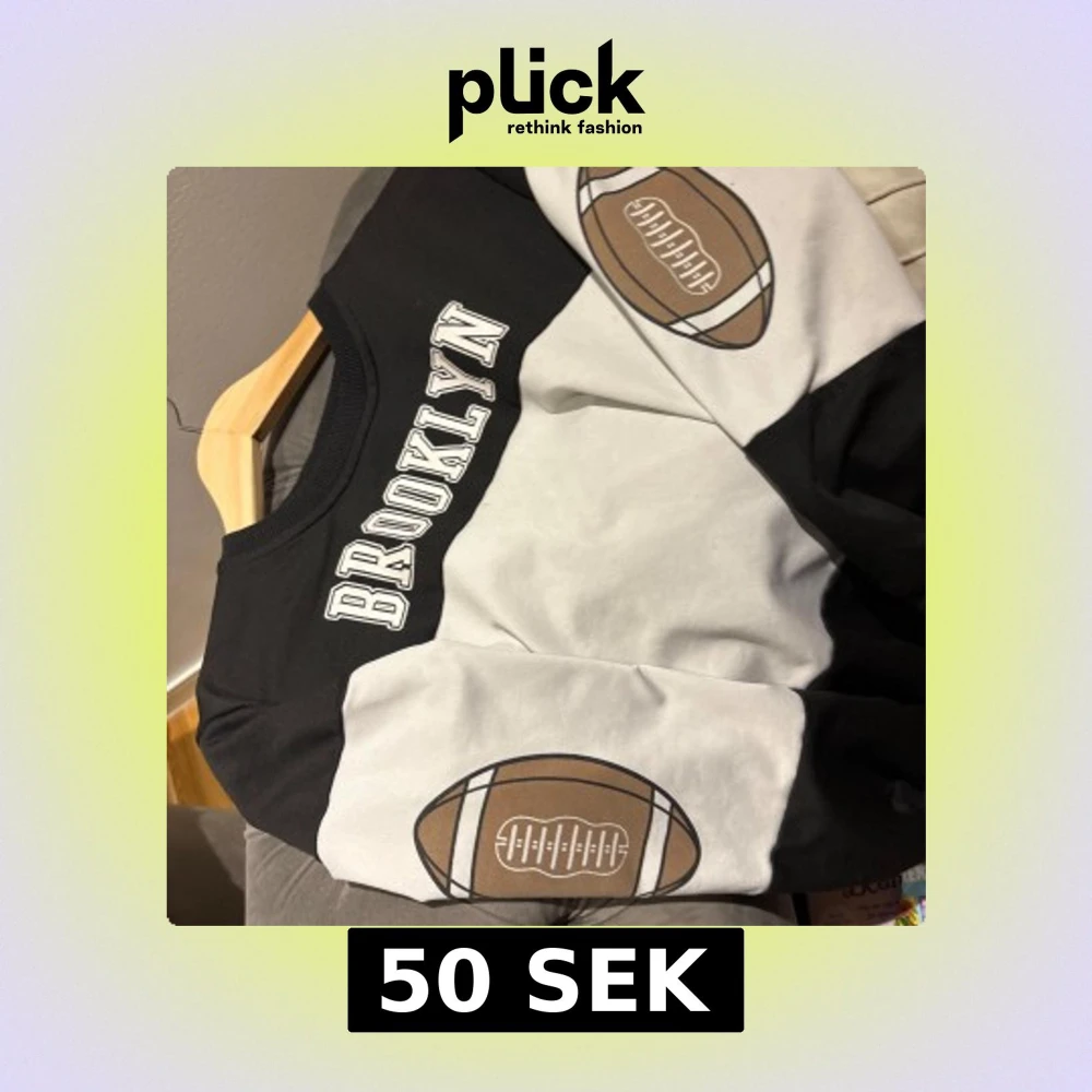 Cool svart och vit sweatshirt med BROOKLYN-tryck över bröstet och stora amerikanska fotbollar på ärmarna. Tröjan har breda blockränder och rund hals. Materialet känns som mjuk bomull eller polyester, perfekt för chill dagar eller sportig stil.