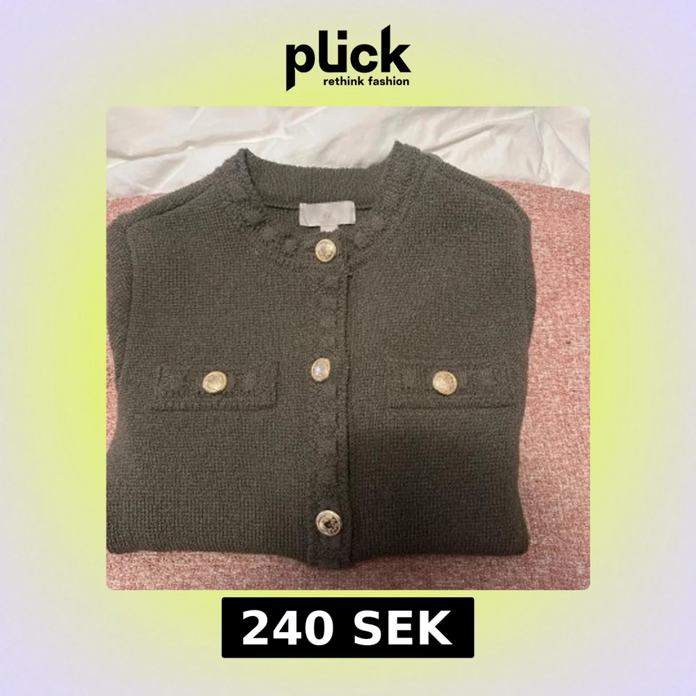 Snygg mörkgrön stickad kofta från H&M med guldfärgade knappar framtill och på fickorna. Koftan har rund halsringning, långa ärmar och två dekorativa bröstfickor. Perfekt för dig som gillar klassisk stil med en twist.