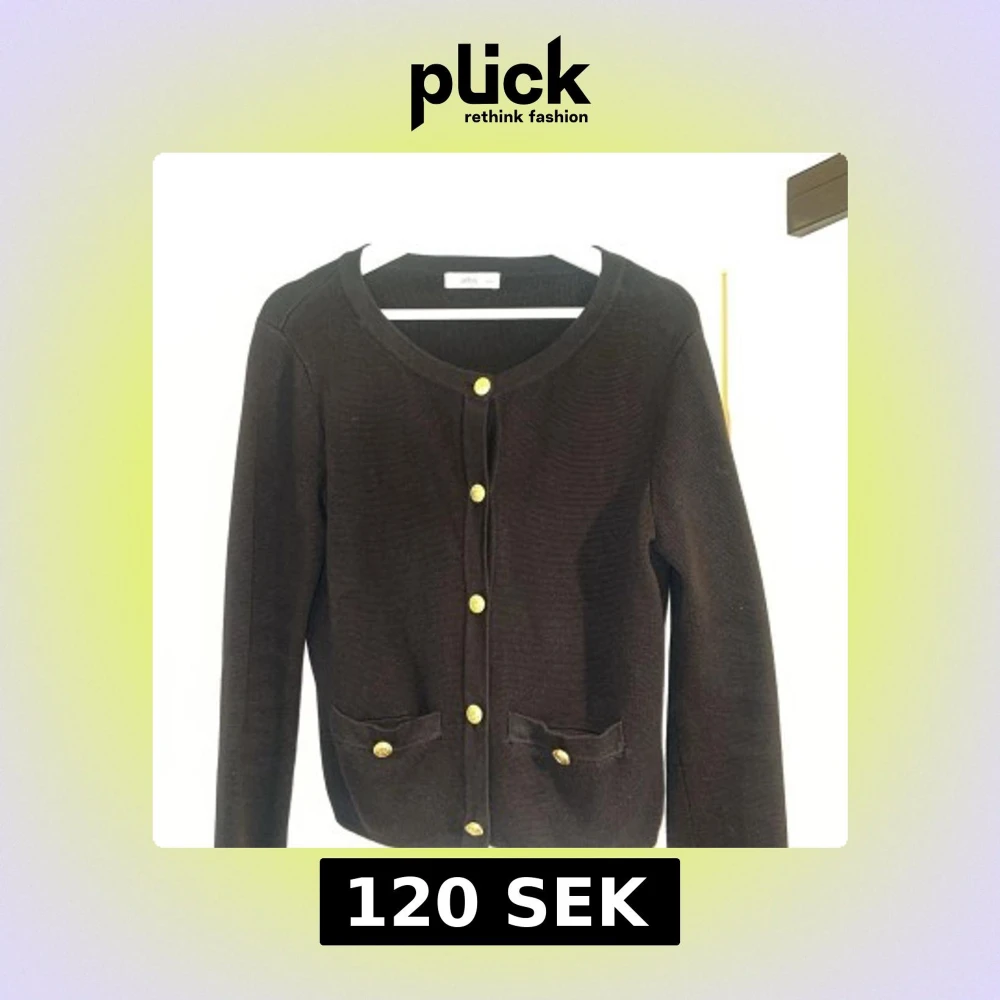 Stilren svart kofta från Ellos med rund halsringning och snygga guldknappar framtill. Två små fickor framtill med matchande knappar. S/M