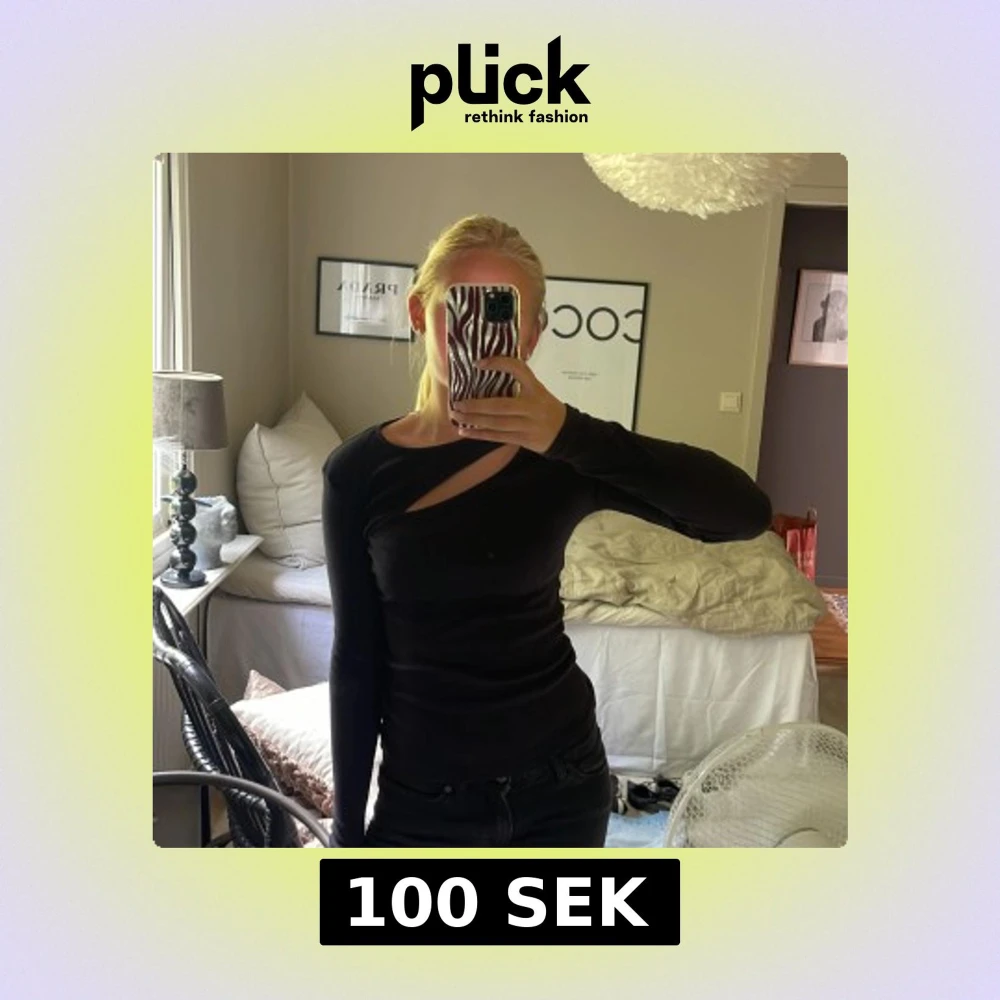 Säljer en svart långärmad topp med cool cut out-detalj vid axeln. Tight passform och ribbad struktur!