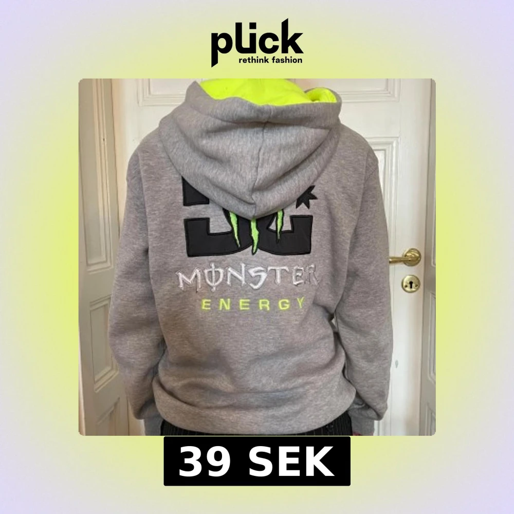 Säljer en grå hoodie från DC och Monster Energy med broderade loggor i svart, vitt och neongrönt. Tröjan har huva med neonfoder, dragkedja framtill och långa ärmar. Perfekt för dig som gillar streetwear och vill sticka ut.
