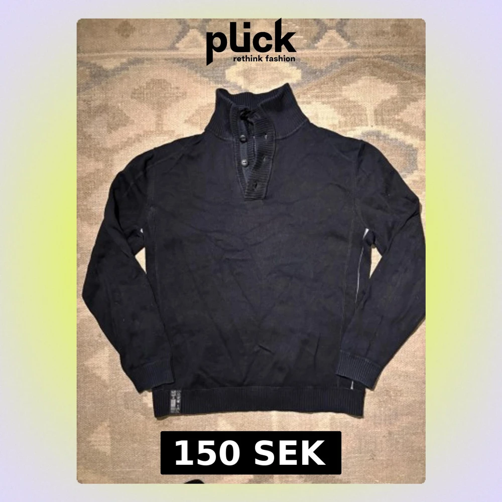 Svart stickad tröja med hög ribbad krage och knappslå framtill. Tröjan har långa ärmar och ribbade muddar vid ärmslut och nederkant. Perfekt för dig som gillar en stilren och enkel look.