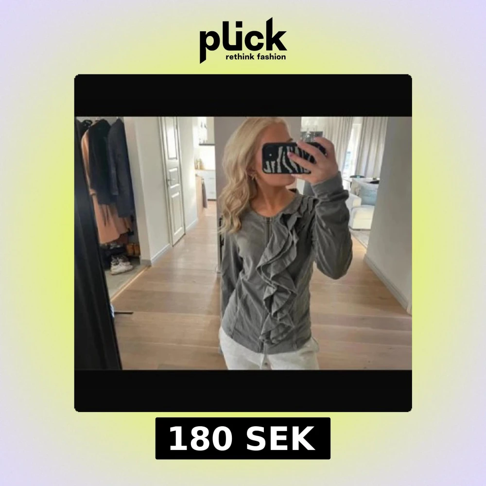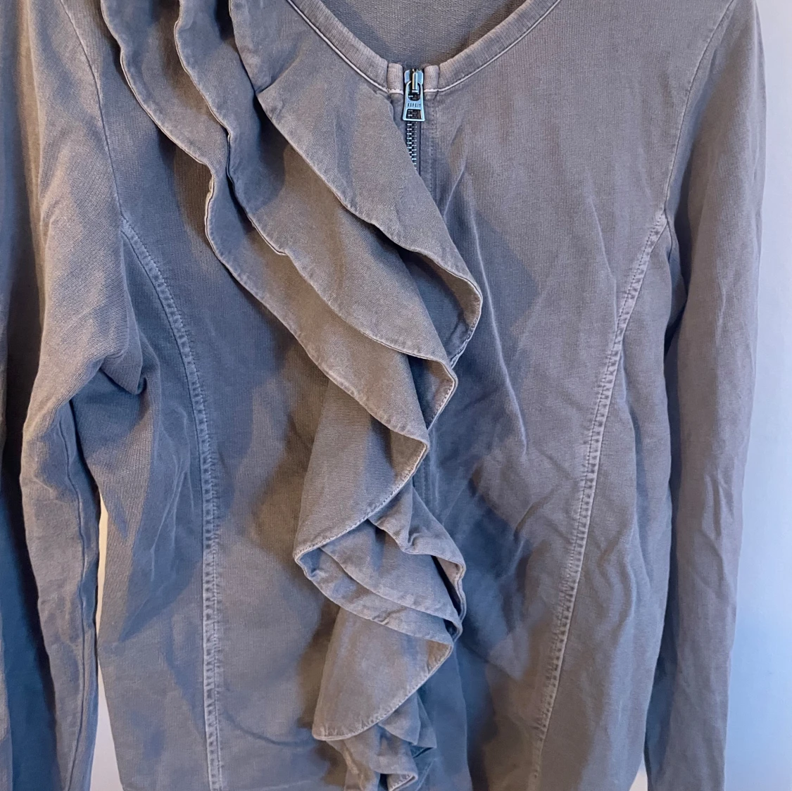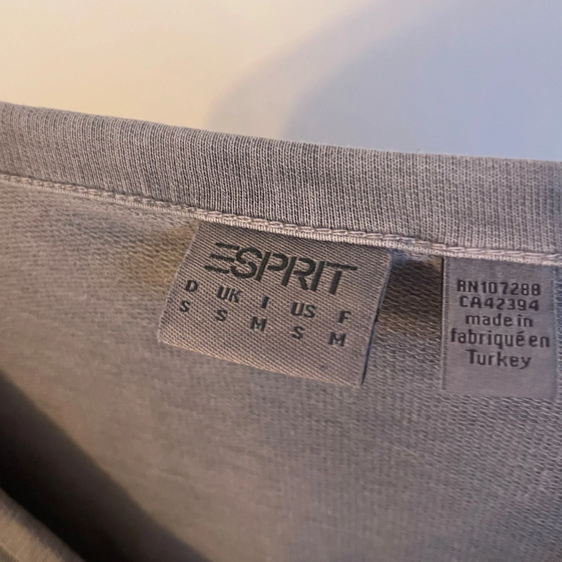 Säljer en stilren grå tröja från Esprit med en snygg volangdetalj framtill. Tröjan har långa ärmar och en dragkedja vid halsen. Perfekt för en chic och avslappnad look.