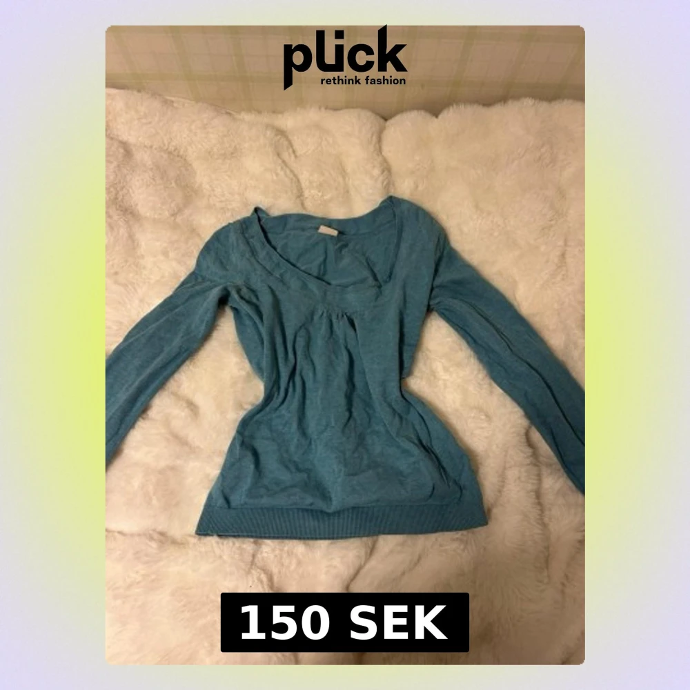 Snygg blå långärmad tröja med djup v-ringning och ribbade muddar. Tröjan har en lätt rynkning vid bysten och är tillverkad i ett mjukt, tunt material som passar perfekt till våren. Enkel och stilren design utan synligt märke. Lite sliten vid knapparna men annars i gott skick.
