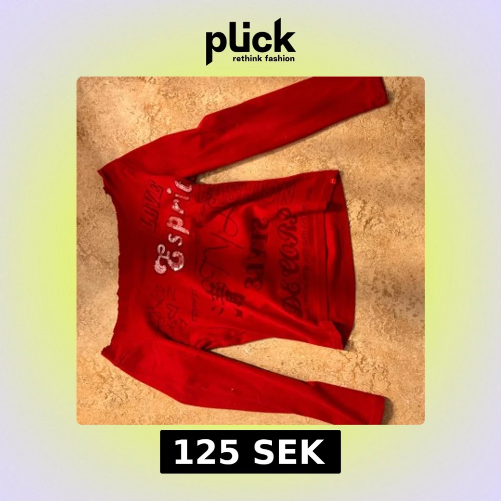 Säljer en röd långärmad topp från Esprit med tryck och paljettdetaljer framtill. Tröjan har bred halsringning och coola grafiska texter i svart och silver. Perfekt för dig som gillar att sticka ut med färg och detaljer. Klippt till off shoulder