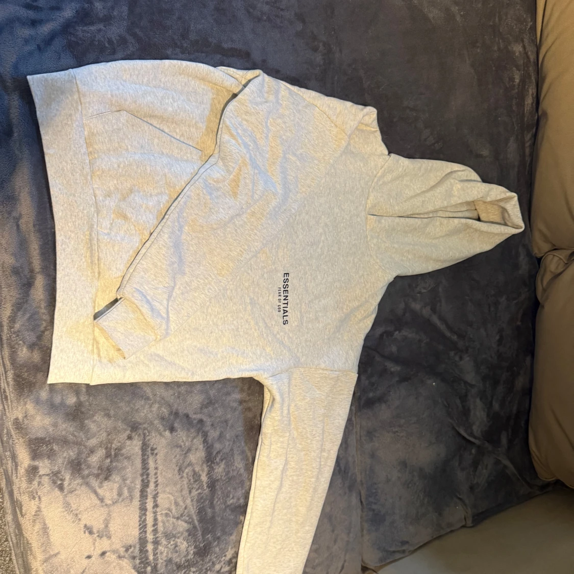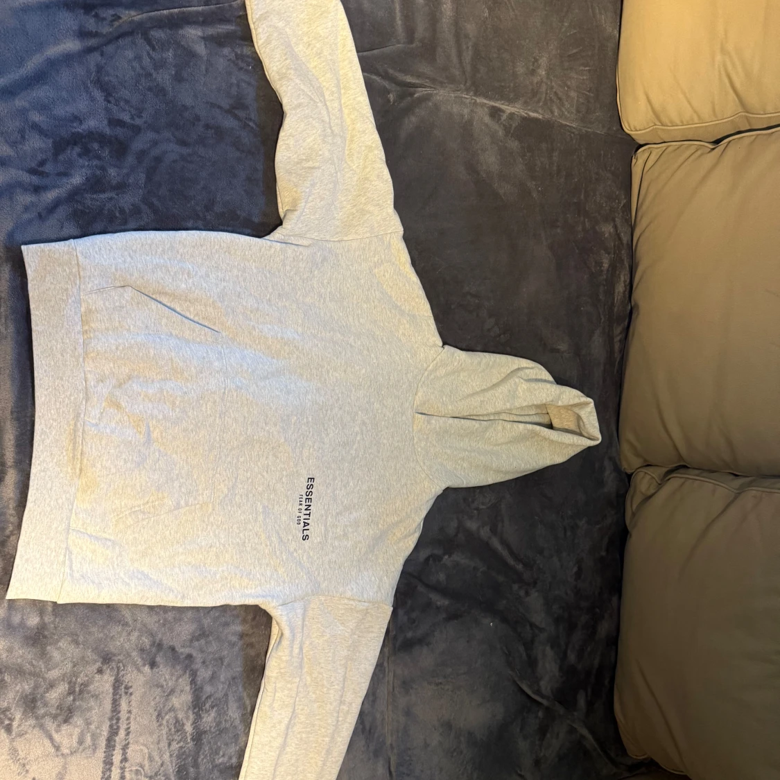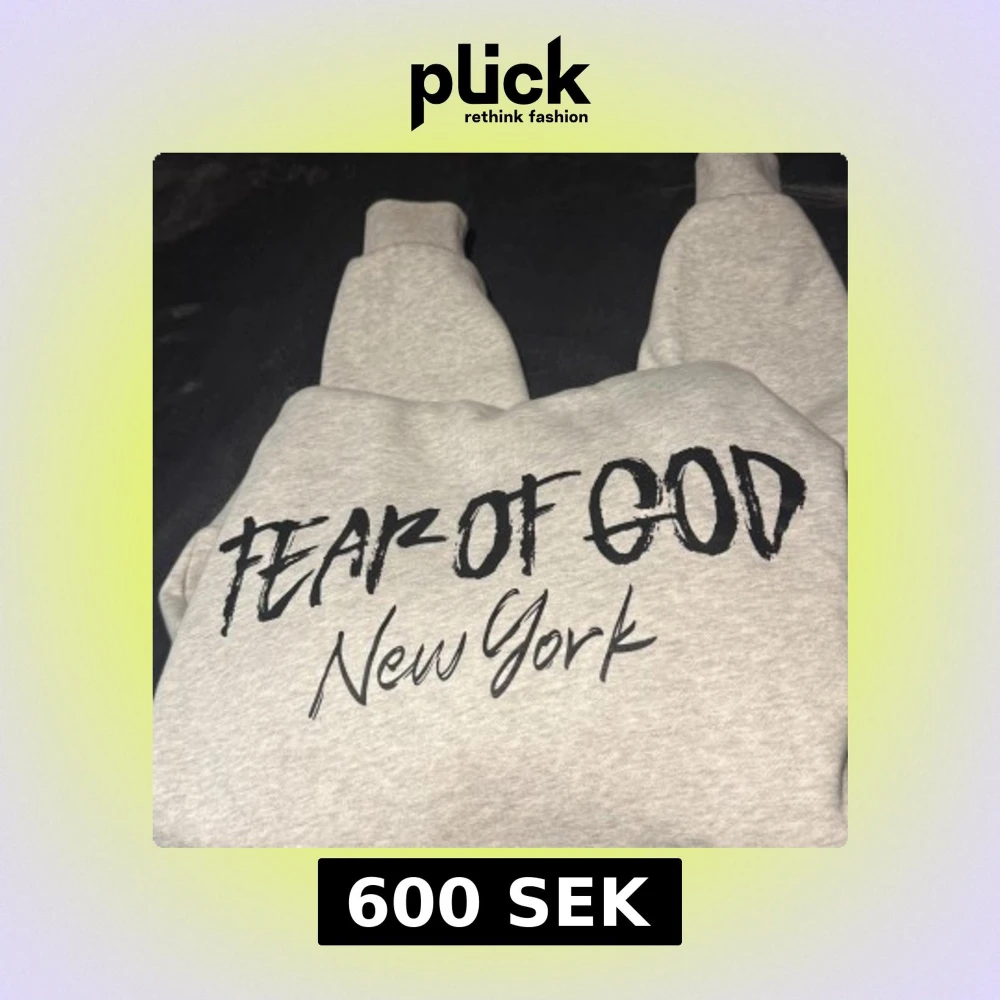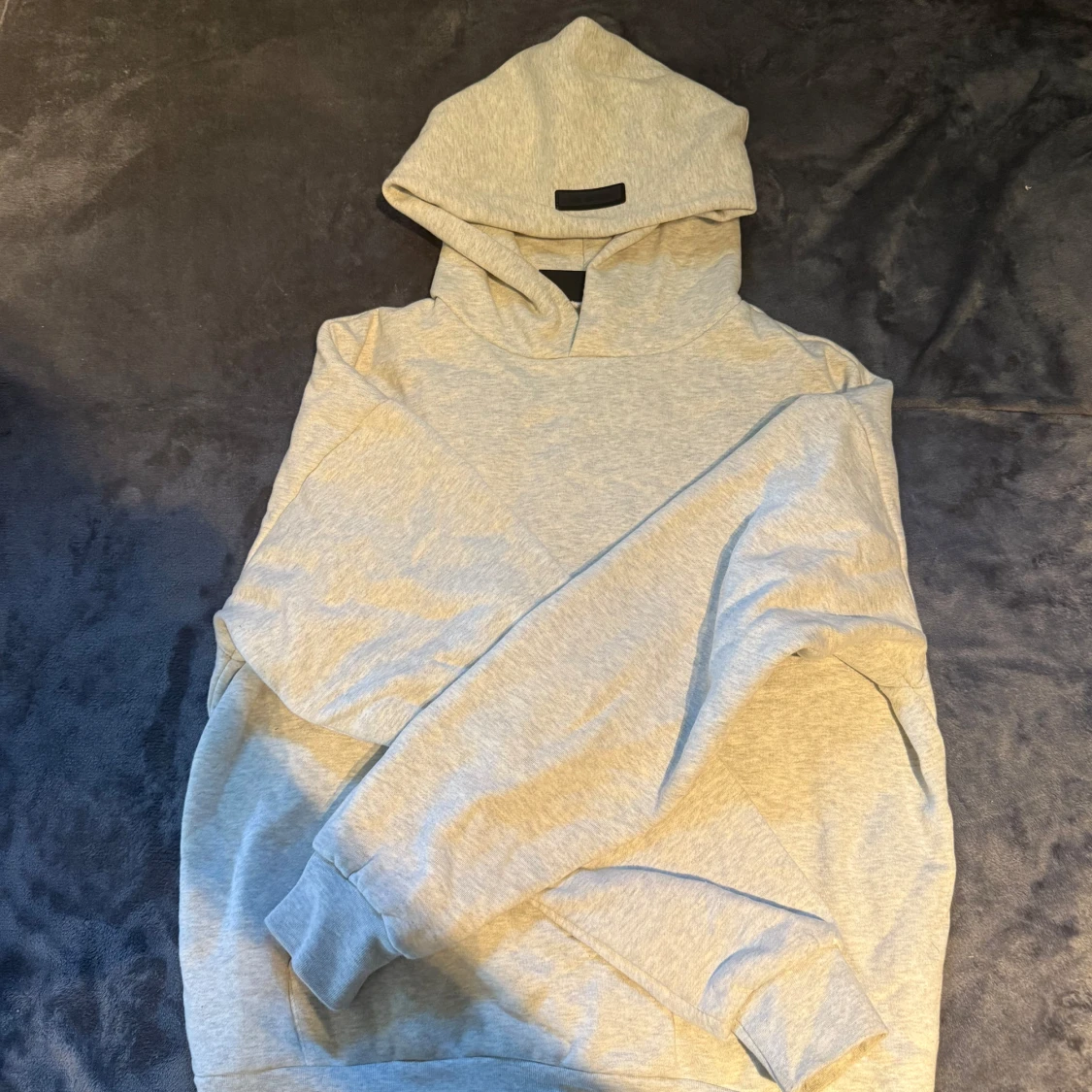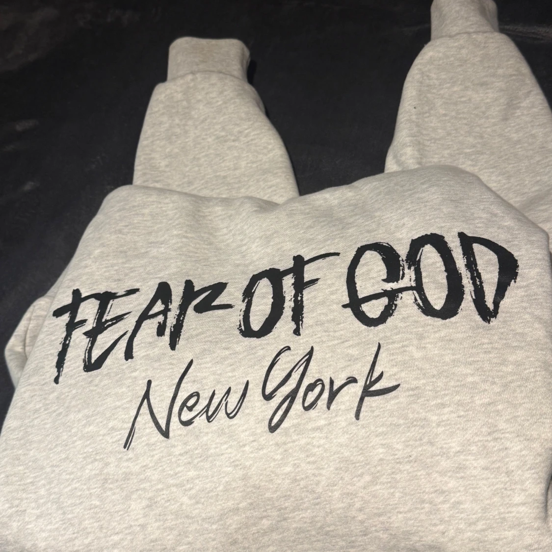 Snygg ljusgrå hoodie från Fear of God Essentials med svart tryck på bröstet och texten 'Fear of God New York'. Klassisk passform med huva och känguruficka. Perfekt för dig som gillar streetwear och vill ha en stilren look.