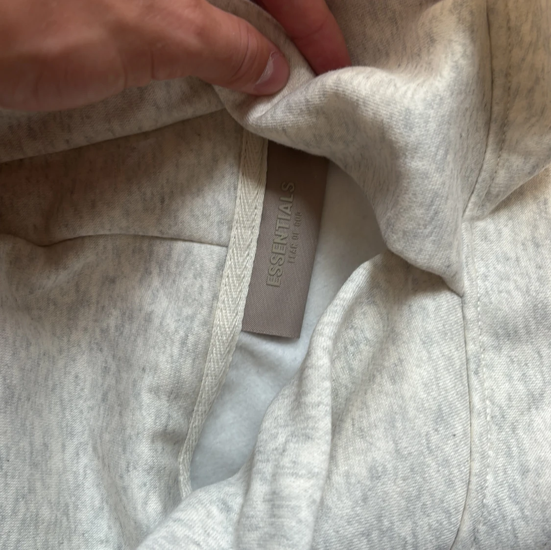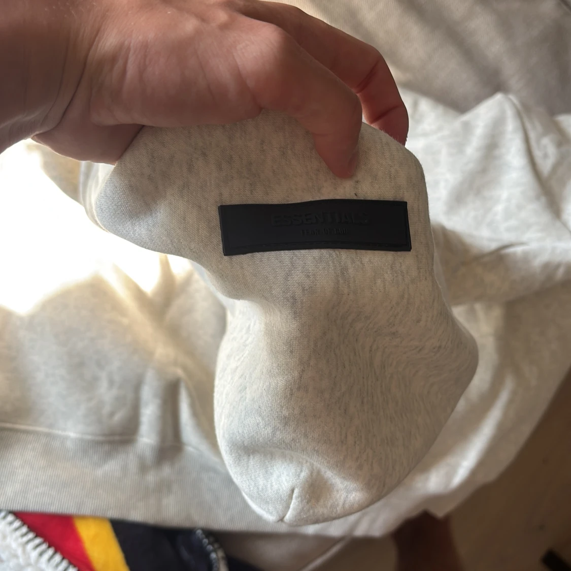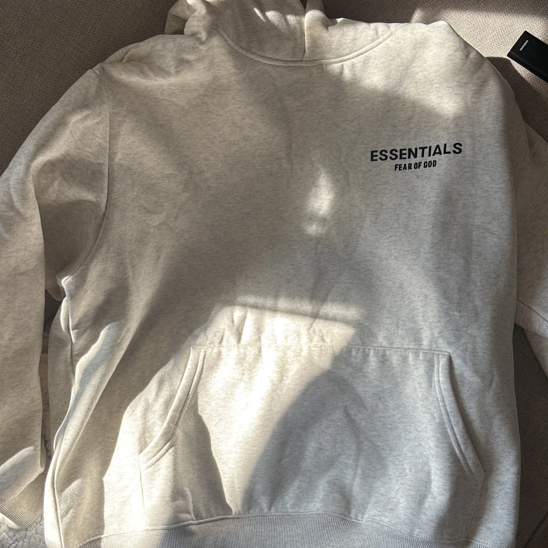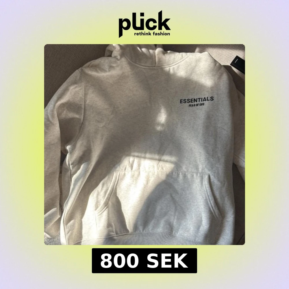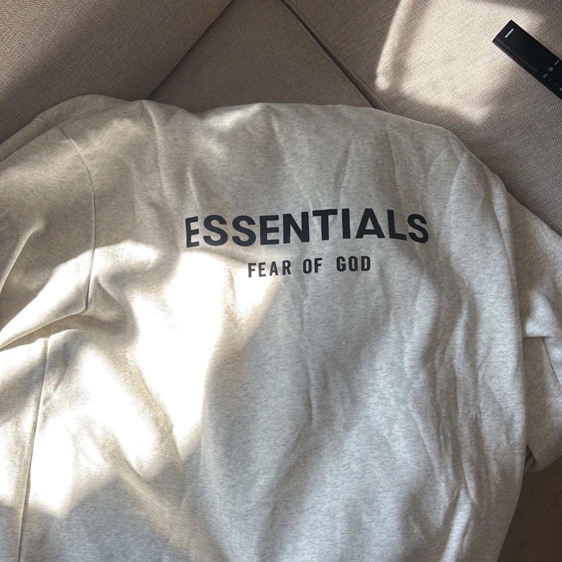 Säljer en stilren grå hoodie från Essentials Fear of God med svart logga på bröstet och ryggen. Tröjan har huva, känguruficka och ribbade muddar. Perfekt för chill dagar och streetwear. Materialet är mjukt och känns riktigt skönt mot huden. Storleken är M/S, den här är helt ny, säljs för att den va för liten för mig