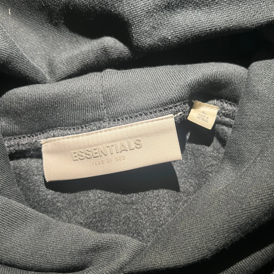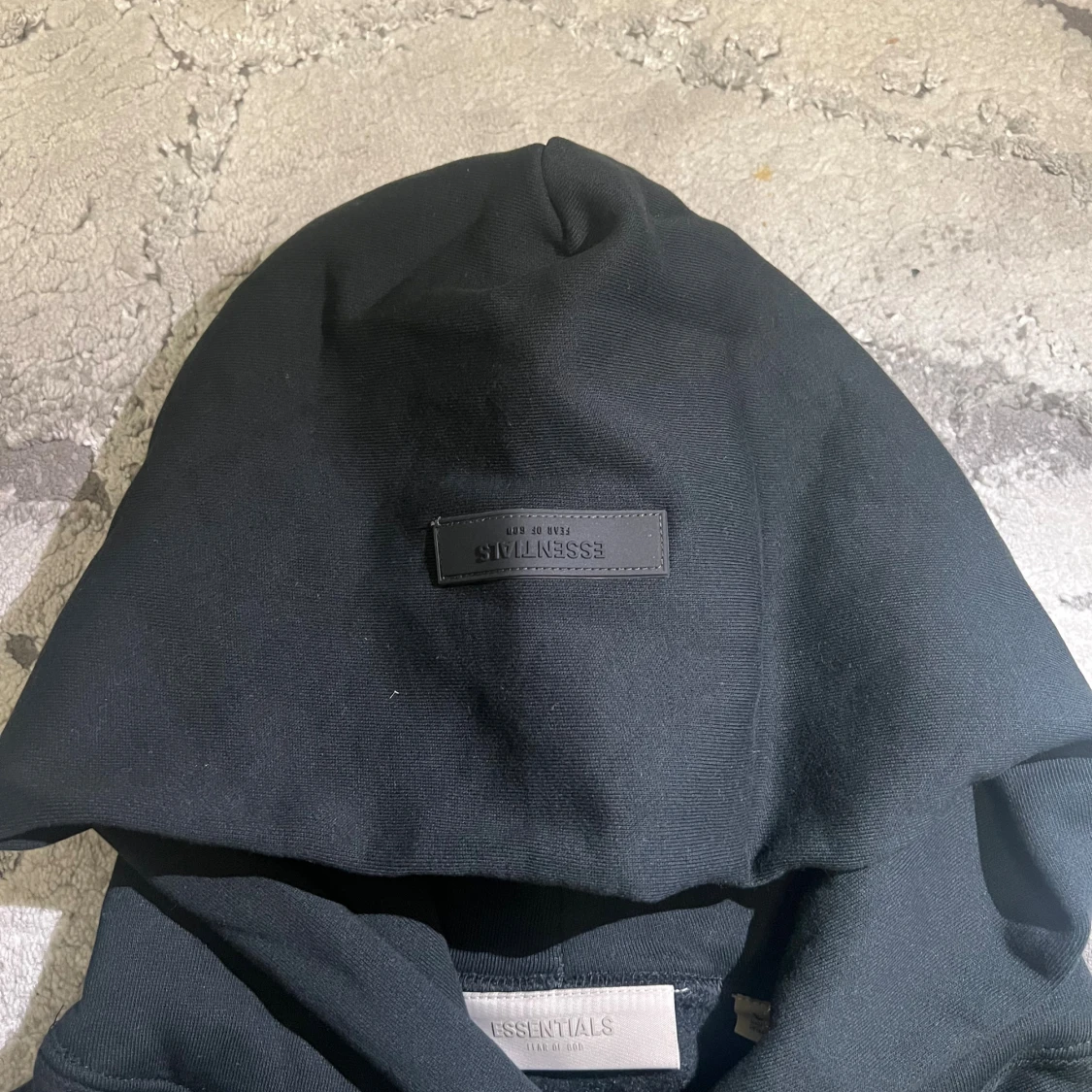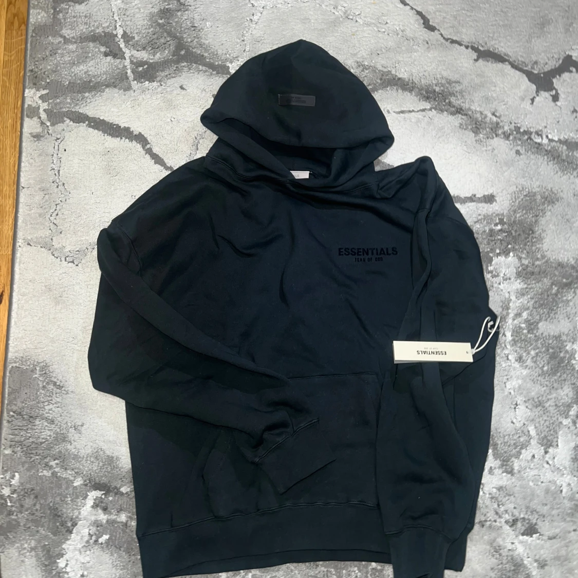 Svart Essentials Fear of God hoodie i streetwear-stil. Oversized passform med tryck fram och bak. Passar M, L och XL – lite beroende på hur du vill att den sitter.