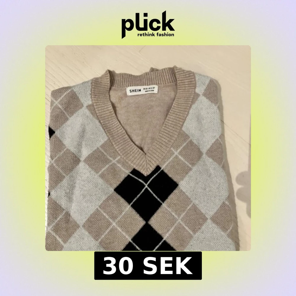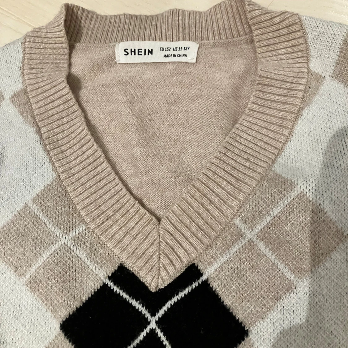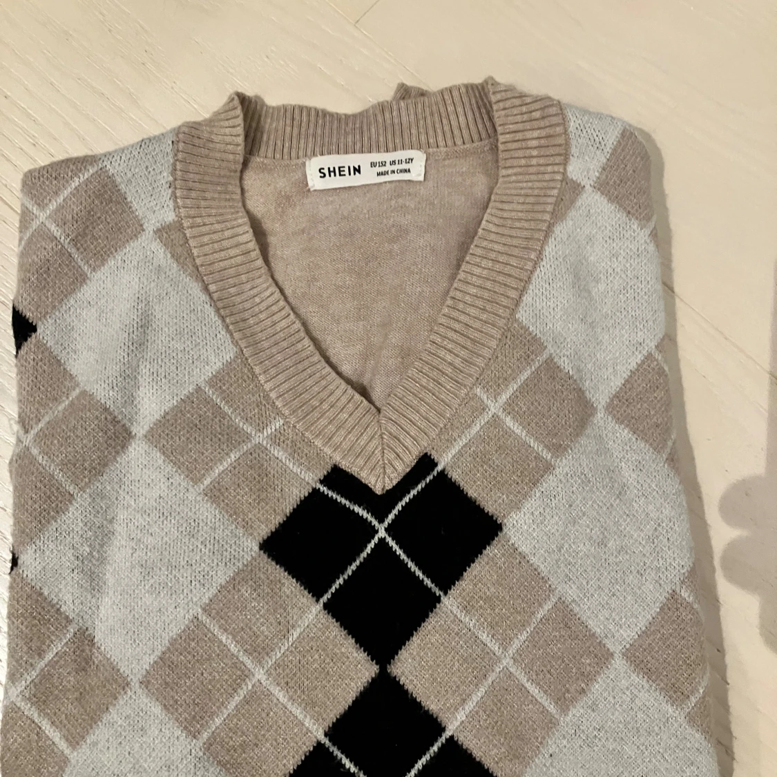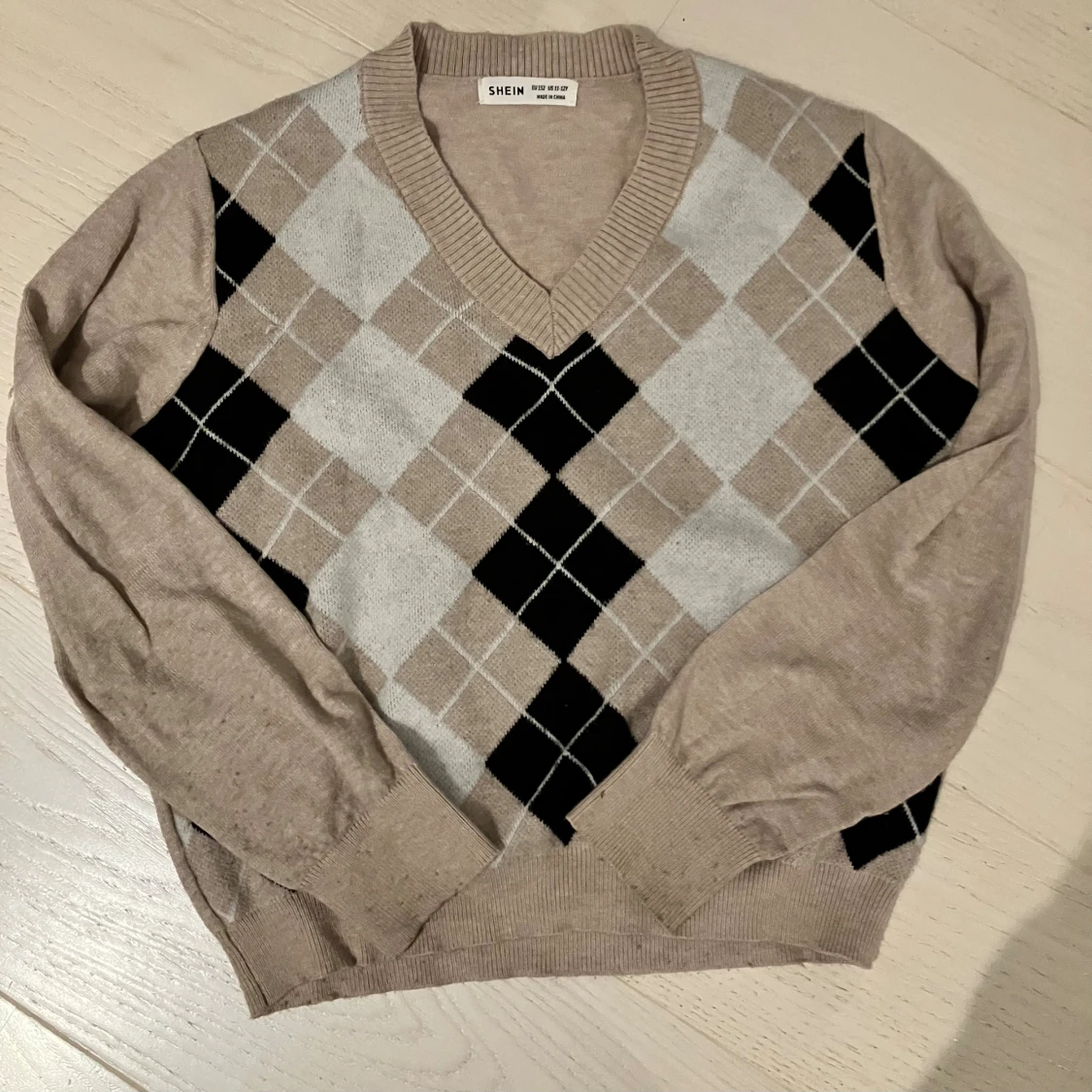 Snygg stickad tröja från Shein med klassiskt rutig argylemönster i beige, svart och grått. Tröjan har v-ringad halsringning, ribbade muddar och långa ärmar.