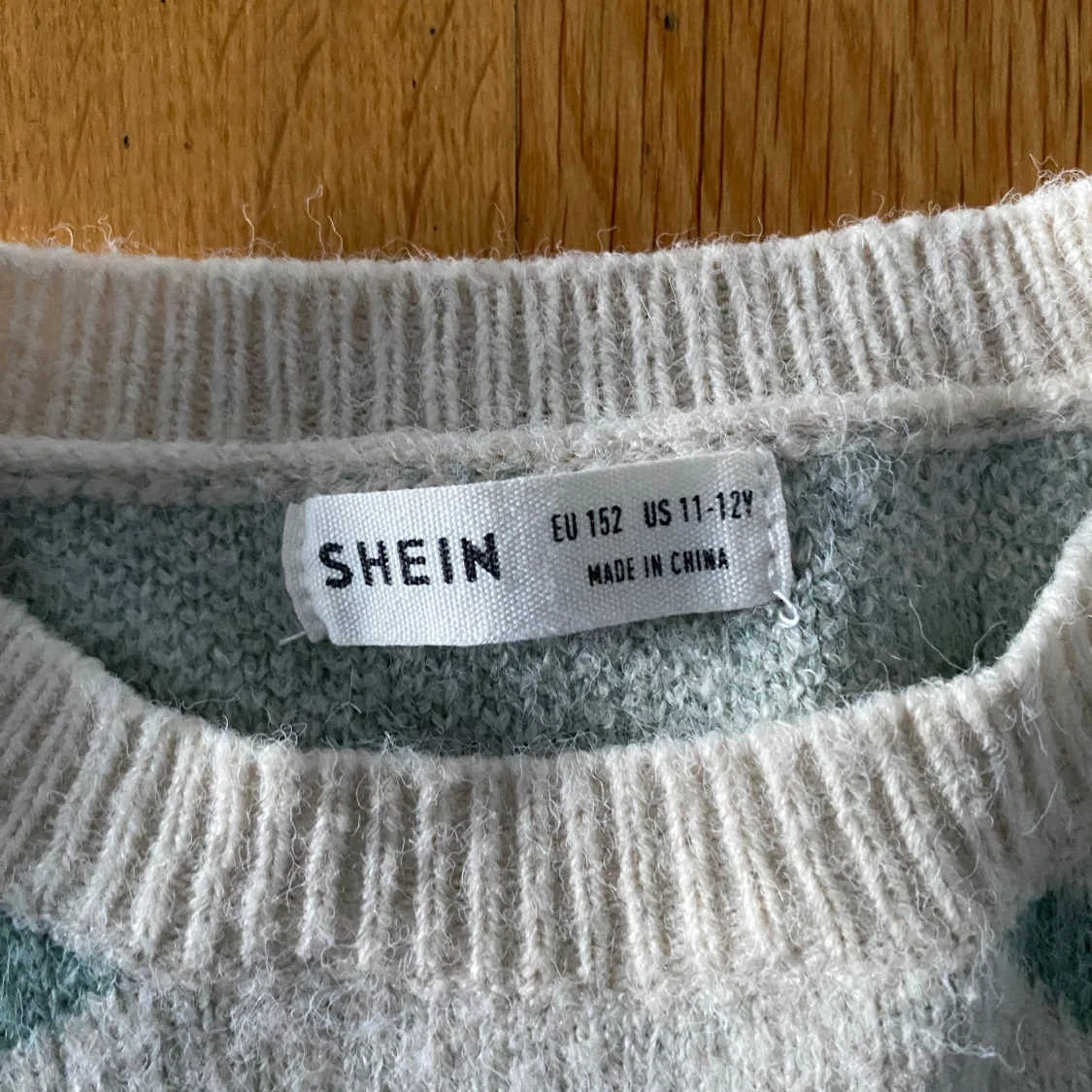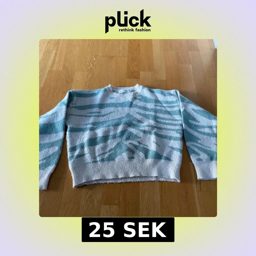Säljer en stickad tröja från Shein i vit och mintgrön zebra-mönster. Tröjan har rund halsringning, långa ärmar och ribbade muddar. Perfekt för dig som gillar unika mönster och mjuka material.