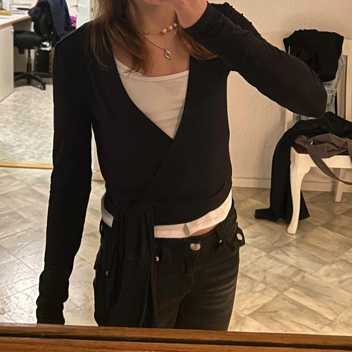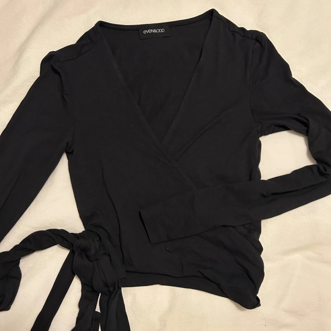 Trendig svart omlottopp från Even&Odd med långa ärmar och knytband i midjan. Väldigt eftertraktad. Är i helt nytt skick och har endast använts en gång. Säljer pga att den ej kommer till användning. Köpt för 210kr.