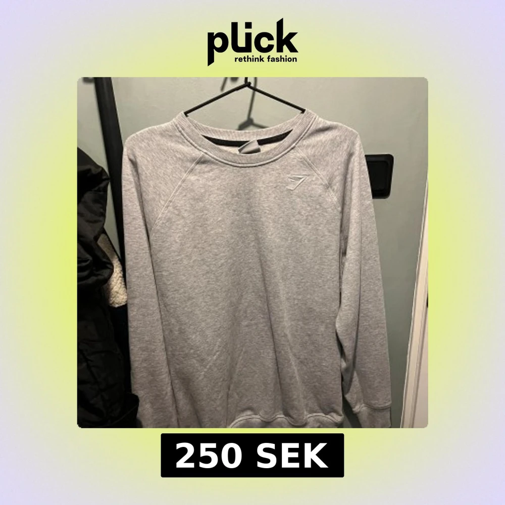 Snygg grå sweatshirt från Gymshark i storlek S. Tröjan har rund hals, ribbade muddar och ett diskret Gymshark-logo broderat på bröstet. Perfekt för chill eller träning, med långärmad passform och mjukt material.
