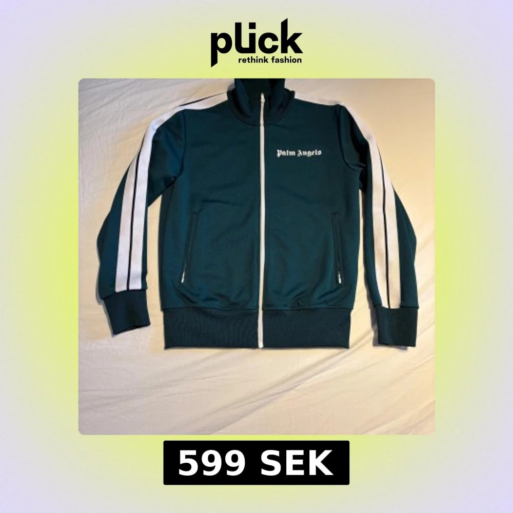 Snygg grön track jacket från Palm Angels med vita ränder längs ärmarna och dragkedja framtill. Jackan har en hög krage och två fickor med dragkedja. Perfekt som tränings tröja eller bara en exklusiv look. Tröjan är använd ca 5 gånger så med andra ord nästan ny.