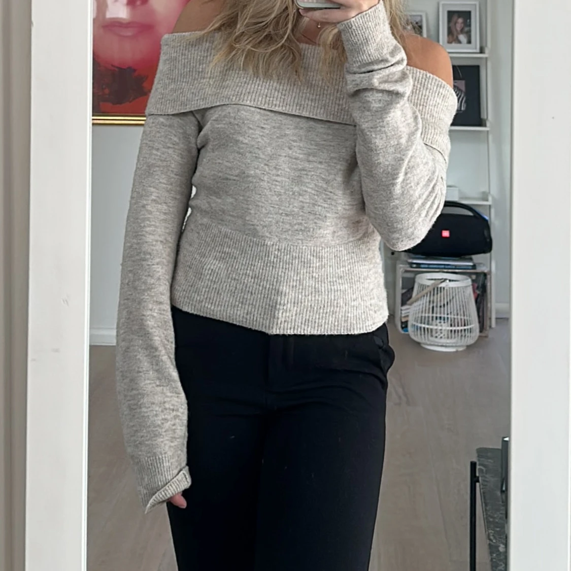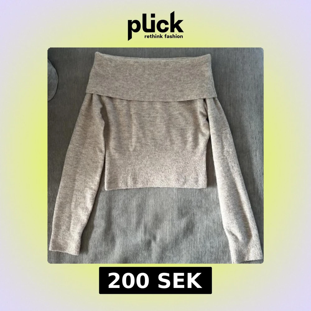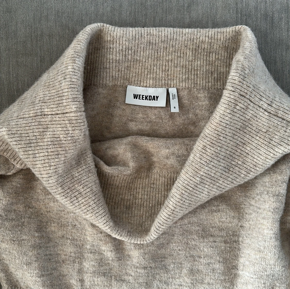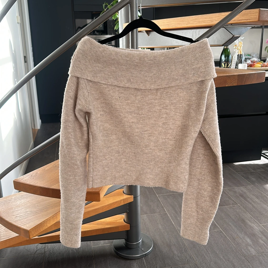 Superfin beige stickad tröja från Weekday med bred ribbad kant och offshoulder-modell. Tröjan har lång ärm och sitter snyggt figurnära med en lite croppad passform. Är inte använd mycket och är i bra skick
