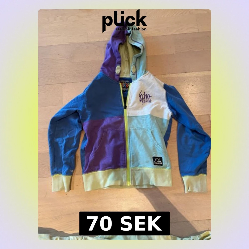 Säljer en unik hoodie från Quiksilver med coola färgblock i blått, lila, vitt och ljusgrönt. Tröjan har huva med snörning, dragkedja framtill och två fickor. Broderad Echo Beach-logga på bröstet och Quiksilver-märke vid fickan. Perfekt för dig som gillar streetwear och färg!