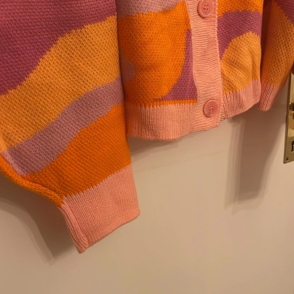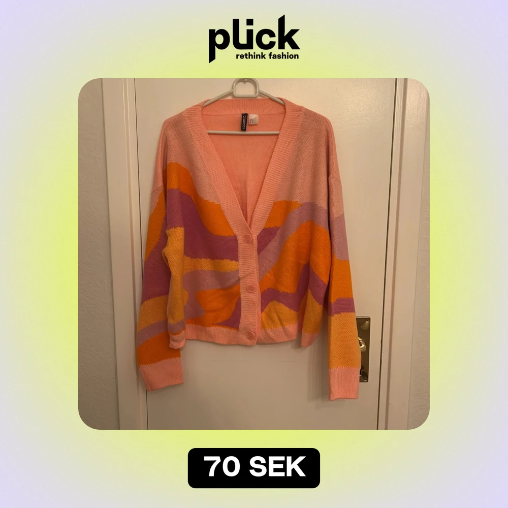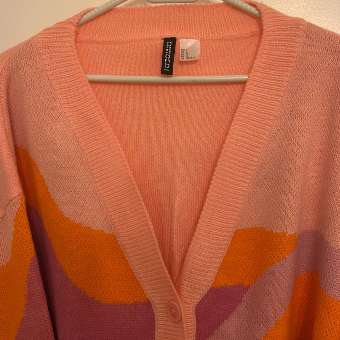 Säljer en superfin och färgglad kofta från H&M Divided i storlek L. Den har ett coolt mönster i rosa, orange och lila nyanser. Perfekt för att liva upp garderoben! Koftan är stickad och har långa ärmar med knappar framtill. Passar perfekt för både vår och höst.