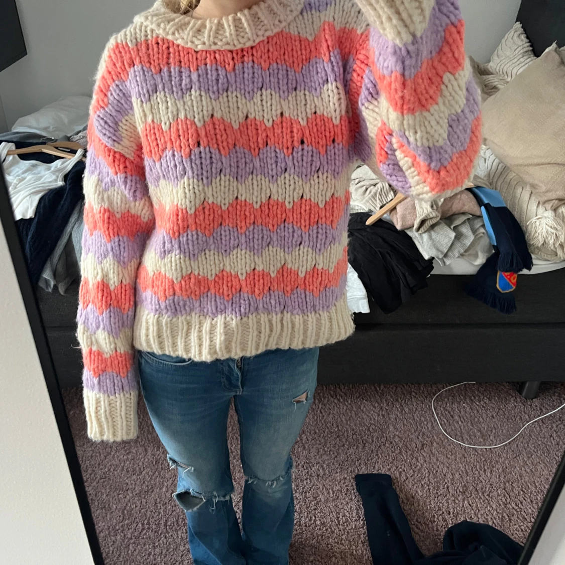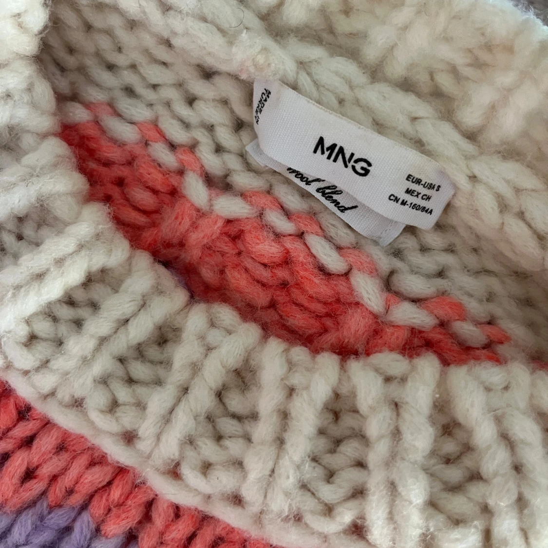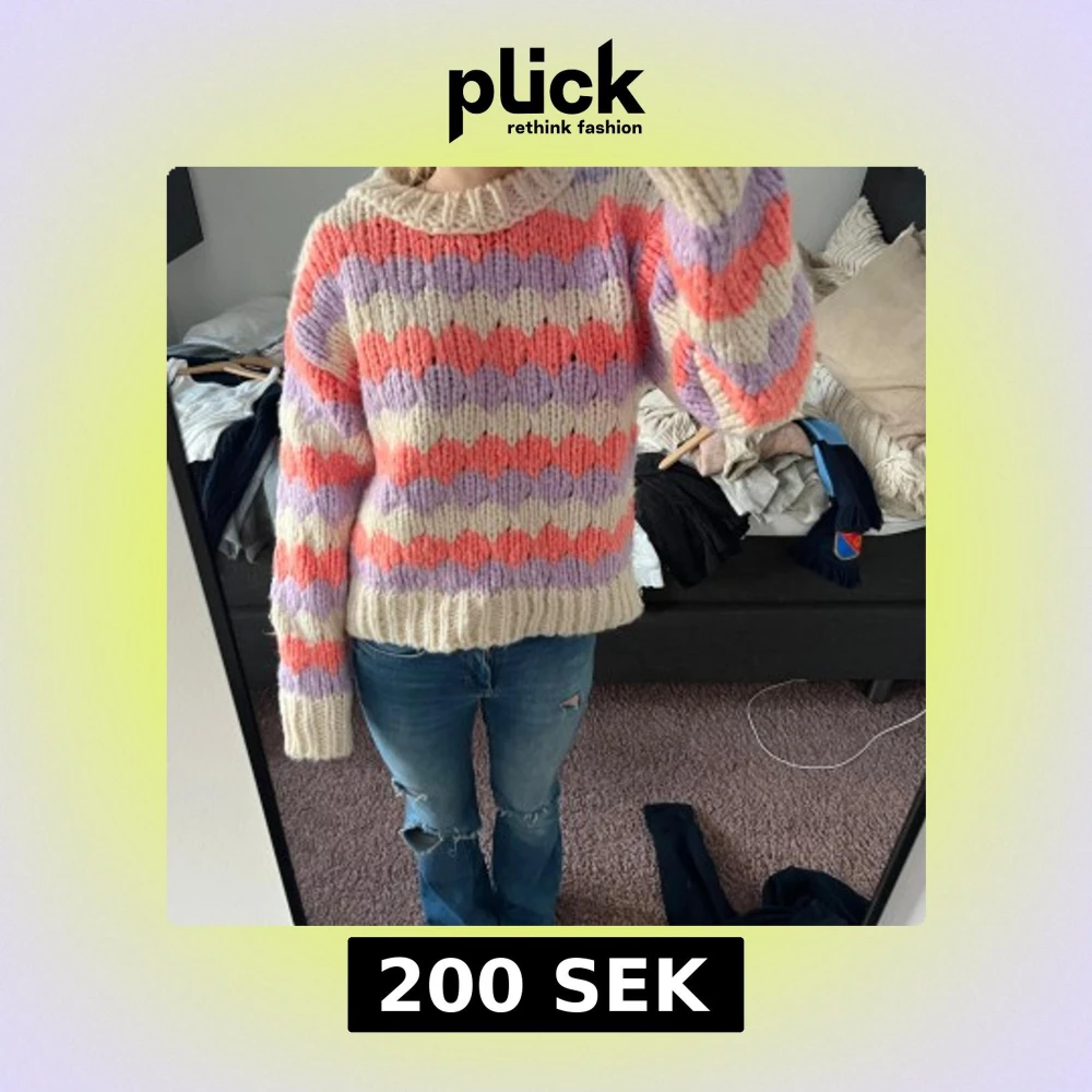 Säljer en mysig stickad tröja från Mango i storlek L men passsar för S. Tröjan har ett randigt mönster i lila, rosa och beige med långa ärmar och ribbade kanter. Super fin vinter/höst tröja som är super skön! Kan diskutera pris!