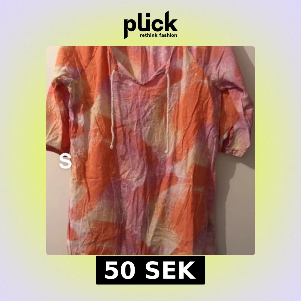 Säljer en tröja i orange, rosa och vit med abstrakt mönster. Tröja har v-ringning med snörning och halvkort ärm. Perfekt för varma dagar och ger en riktigt somrig vibe.🌸Fint använt skick. Tunt material. Storlek s