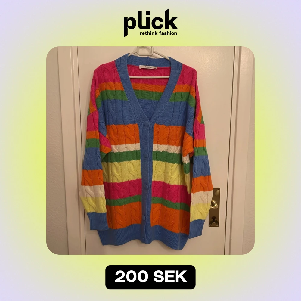 Säljer en superhärlig och färgglad kofta från Touché i storlek L. Den är stickad med breda ränder i blått, rosa, orange, grönt, gult och vitt. Koftan har en v-ringad design med knappar framtill och långa ärmar. Perfekt för att liva upp vilken outfit som helst! 🌈använt en gång och köpt från zalando