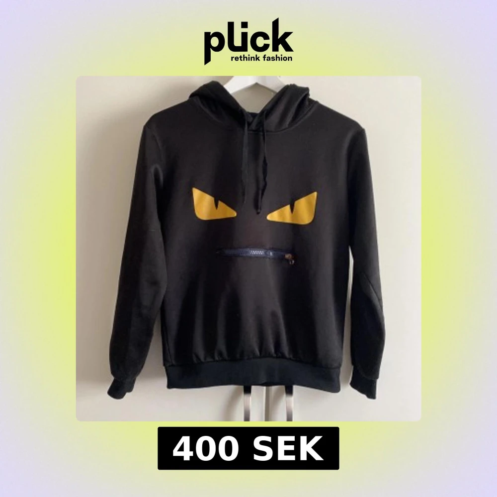 Cool svart hoodie med huva och snörning, prydd med gula ögon på bröstet och en dragkedja under som mun. Matchande byxor, prydd med gula ögon på fickorna.
