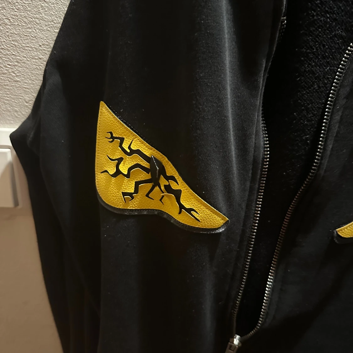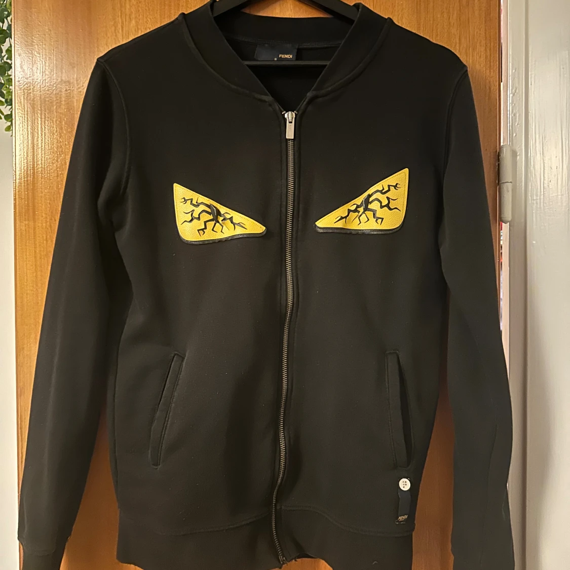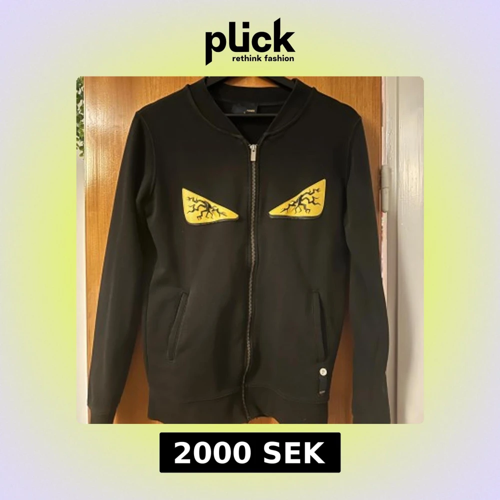 Svart hoodie från Fendi med dragkedja och två fickor. På bröstet finns två gula applikationer som ser ut som ögon med svarta blixtliknande detaljer. Tröjan har lång ärm och en clean, modern look som sticker ut.