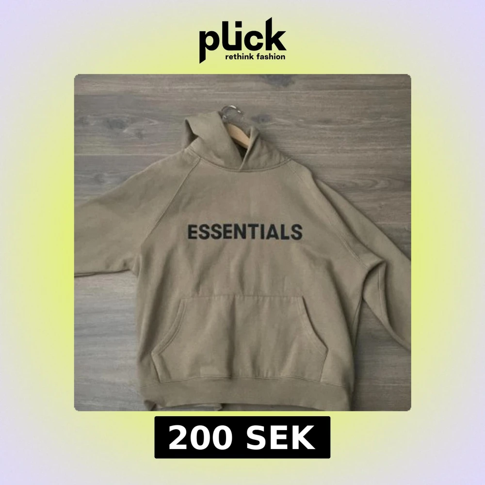 Säljer en beige hoodie från Essentials med svart text på bröstet. Tröjan har huva, magficka och ribbade muddar. Perfekt för en avslappnad och stilren look. Storlek S.