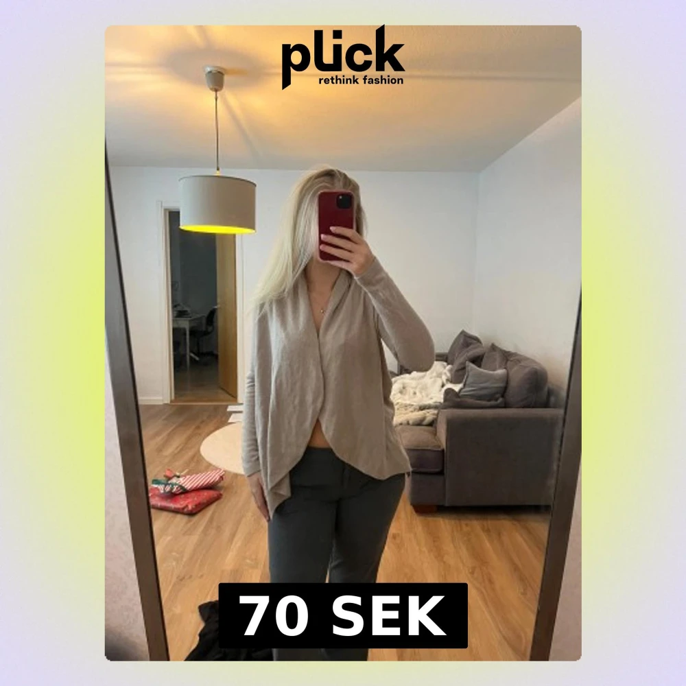 Beige kofta med fickor, inga knappar eller nåt men ”stannar” där man lägger den, lite nopprig