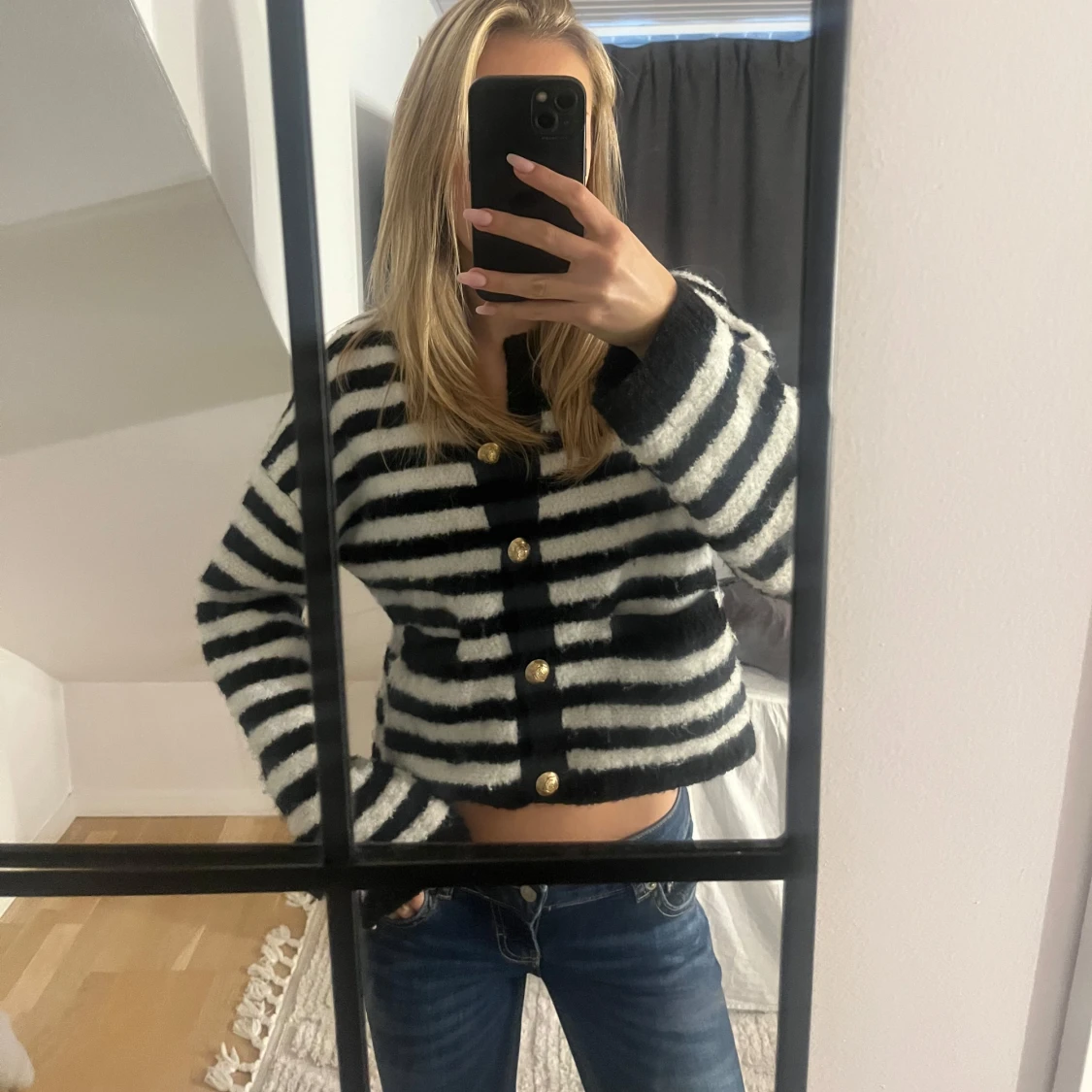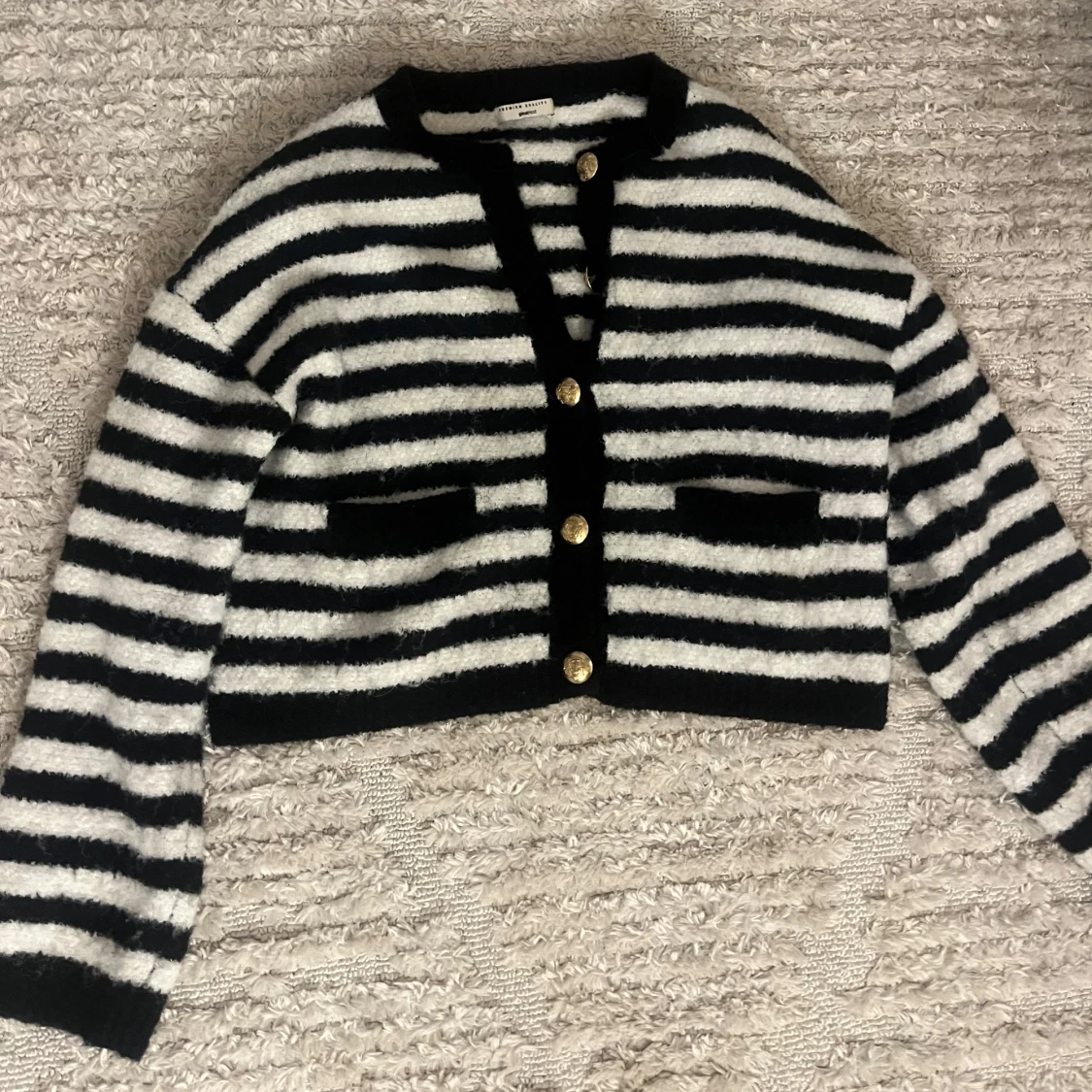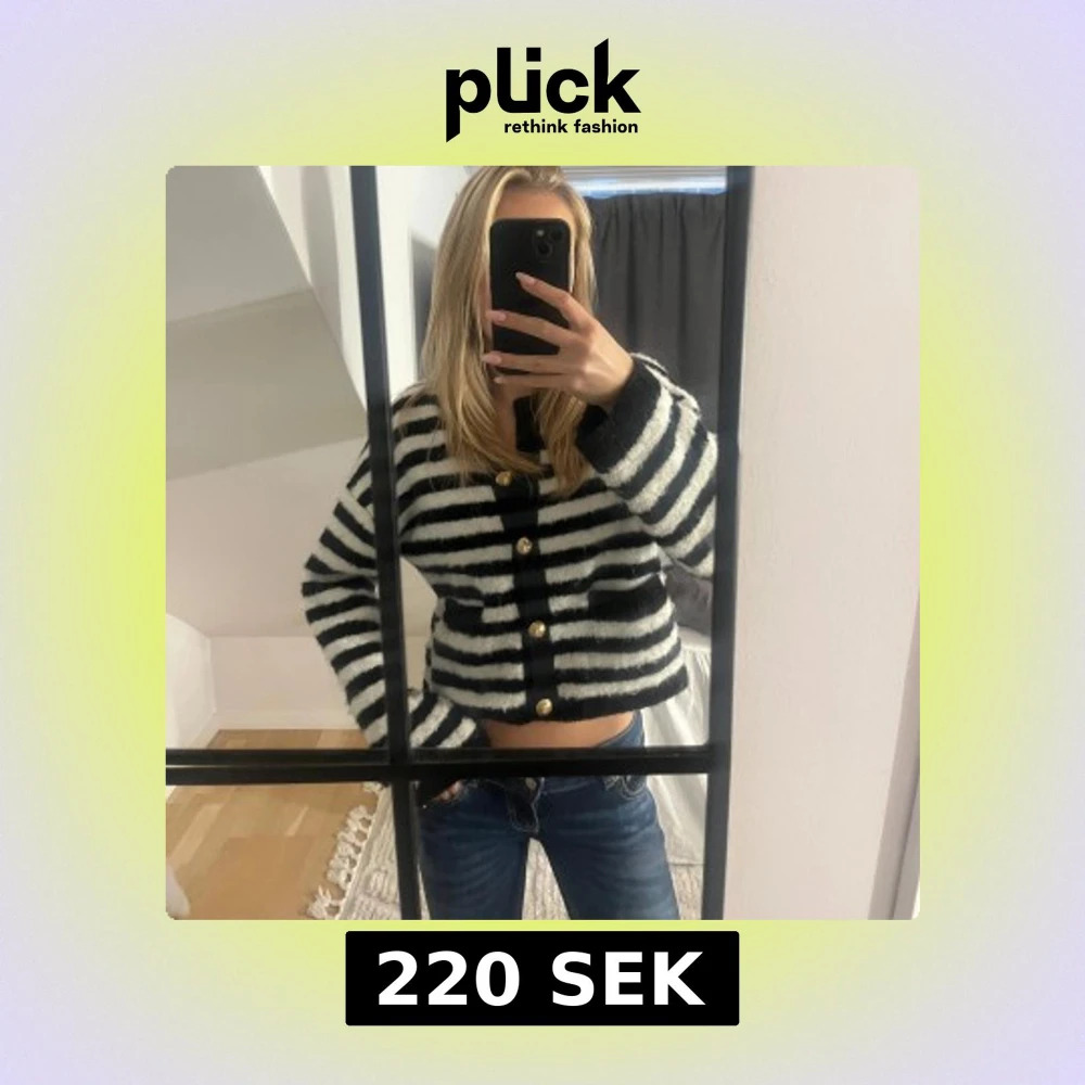 Säljer en svartvit randig kofta från Ginatricot! Koftan har snygga guldknappar framtill, två fickor på sidorna och långa ärmar. Perfekt att slänga på sig! 🤍