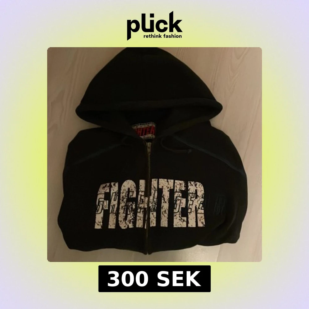 Mörk blå hoodie från Fighter Gear med stort vitt tryck 'FIGHTER' över bröstet. Skick 8/10. Riktigt fräsch och vintage. Storlek S. Skriv vid minsta fundering!