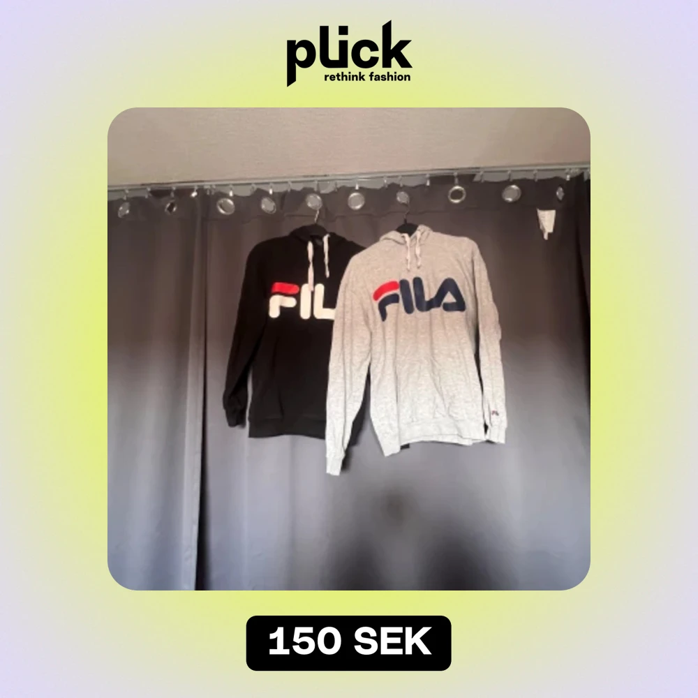 Två hoodies från FILA, en svart och en grå. Båda har FILA-logotypen tryckt på framsidan i rött, vitt och blått. Hoodiesarna har långa ärmar och dragsko vid huvan.