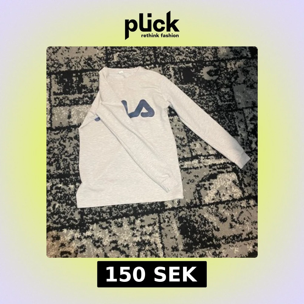 Säljer en stilren grå långärmad tröja från FILA med deras ikoniska logga i blått och rött på bröstet. Perfekt för en avslappnad look.