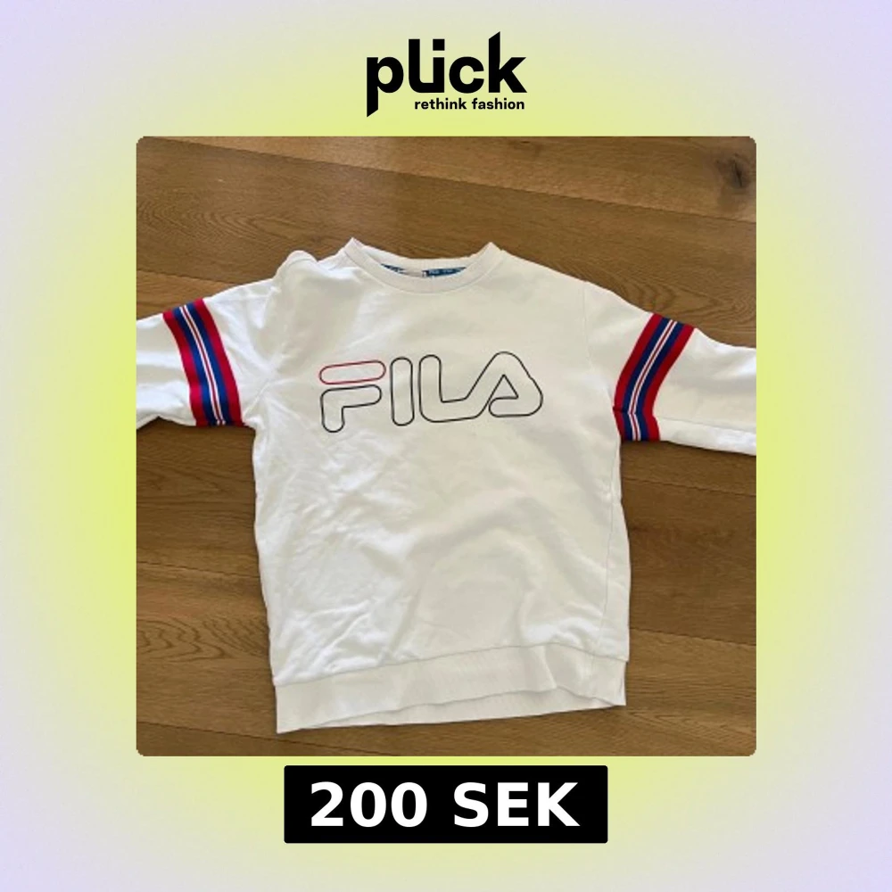 Vit sweatshirt från FILA med stort logotryck framtill. Ärmarna har röda och blå ränder som ger en sportig känsla. Rund halsringning och mjukt material, perfekt för en avslappnad stil. Passar nog kvinnor men den är gjord för herr.