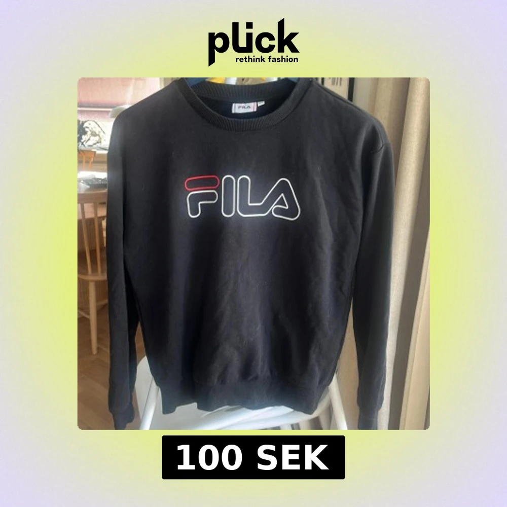 Säljer en svart sweatshirt från FILA med deras ikoniska logga i vitt och rött på bröstet. Tröjan har långa ärmar och en rund halsringning med ribbade muddar vid ärmslut och nederkant. Perfekt för en avslappnad stil.