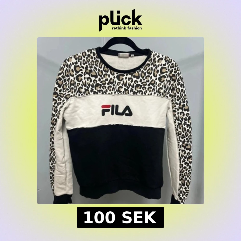 Cool sweatshirt från FILA med leopardmönster på axlar och ärmar, svart nederdel och vit bröstpanel med stor logga framtill. Rund halsringning och långa ärmar. Perfekt statement-plagg för dig som gillar att sticka ut.
