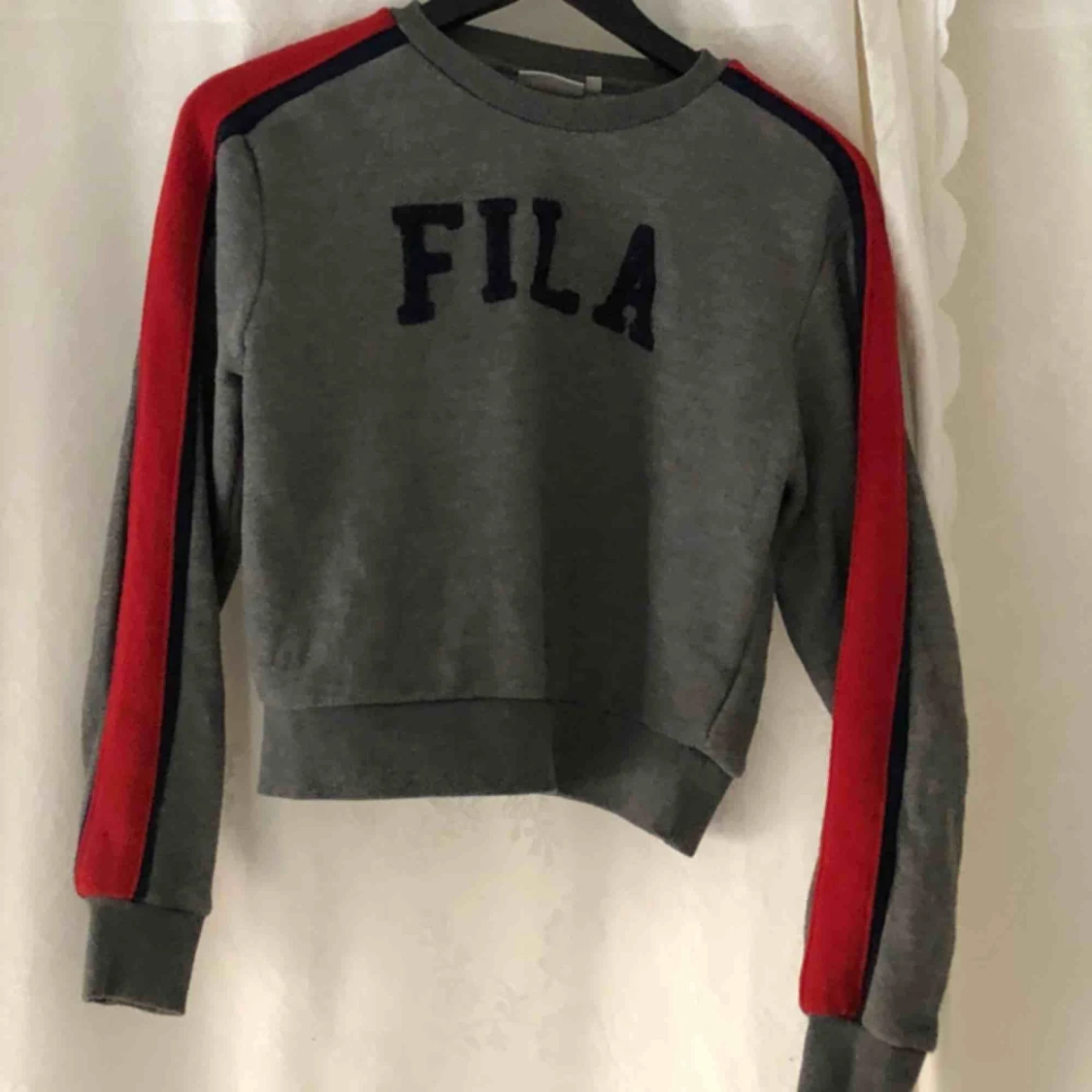 Jättefin fila tjocktröja som är grå med röda sträck på armarna. Jättefint skick använd ett fåtal gånger.