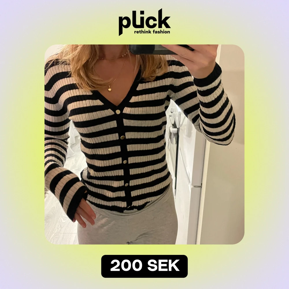 Säljer en snygg och stilren randig kofta från Filippa K. Den är svart och vit med knappar hela vägen ner och har en v-ringad design. Perfekt för både vardag och lite finare tillfällen. Koftan är i bra skick och passar perfekt till höst och vår. Väldigt skönt material! Aningen ”urtvättad”.