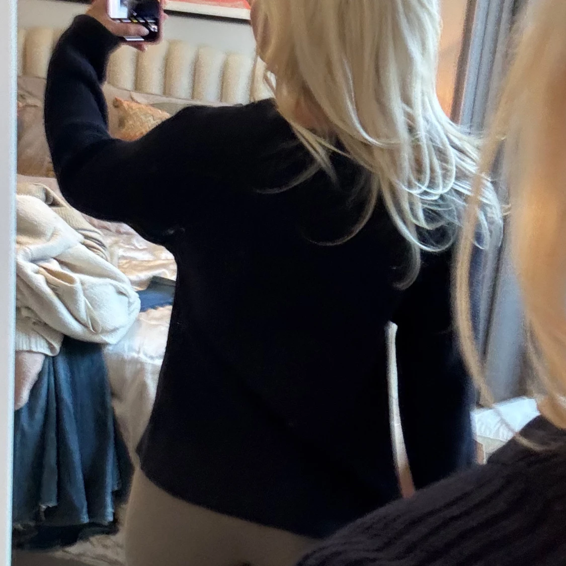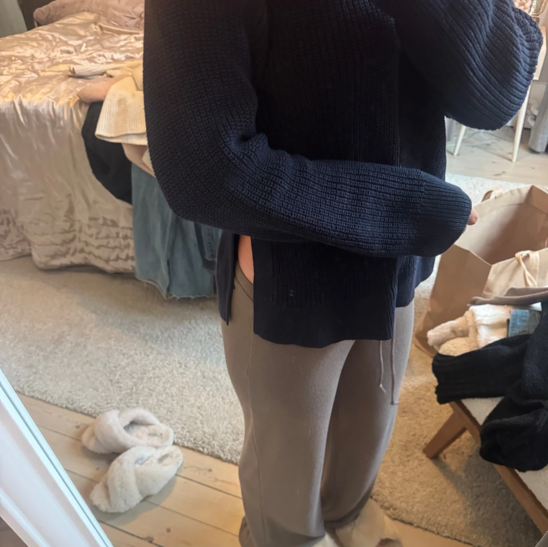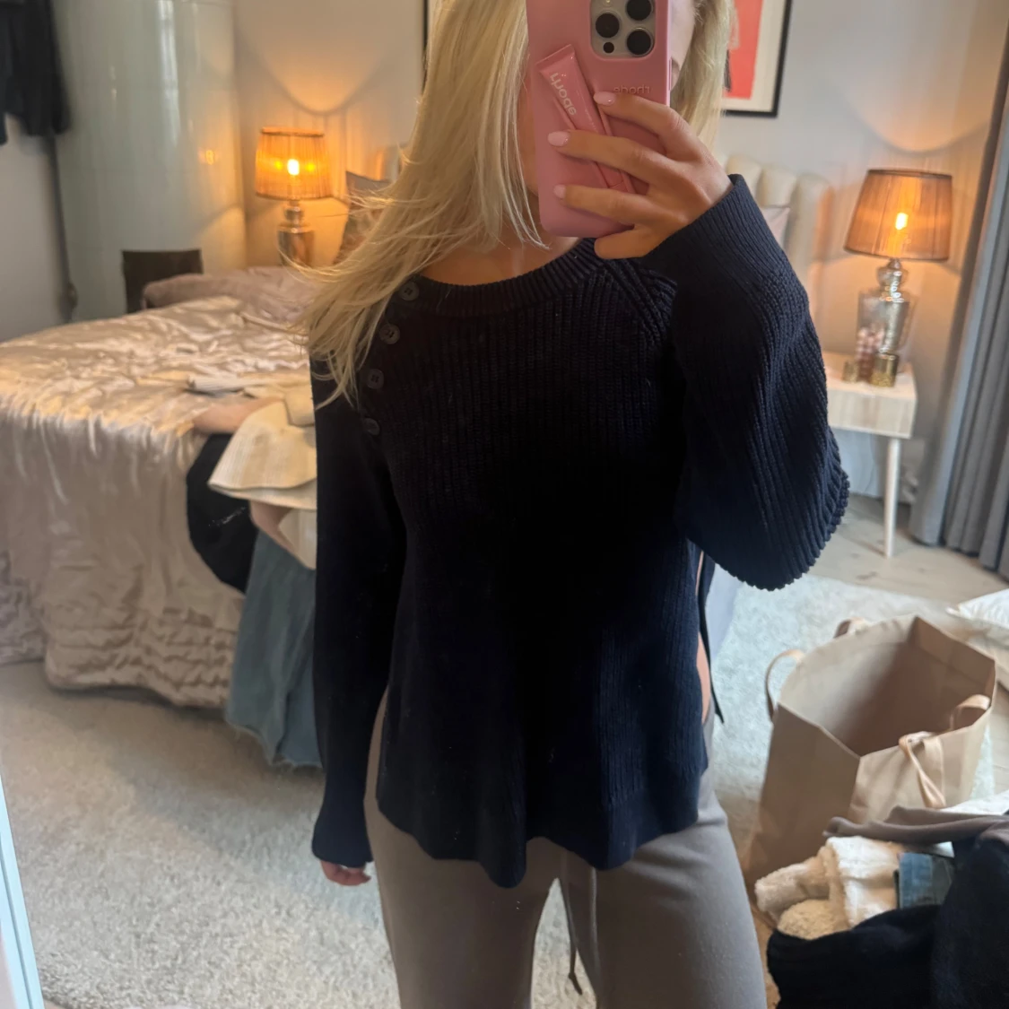 Säljer en blå stickad tröja med rund hals och dekorativa knappar på axeln. Den har en liten slits på båda sidorna, från Filippa k