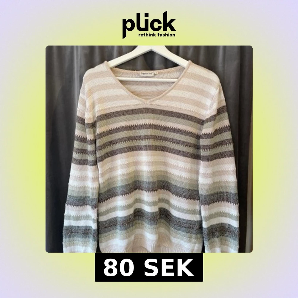Säljer en randig tröja från Cappuccini i mjuka toner av beige, grön och vit. Tröjan har en v-ringad hals och långa ärmar. Den är stickad men är tunn och har en skön passform.