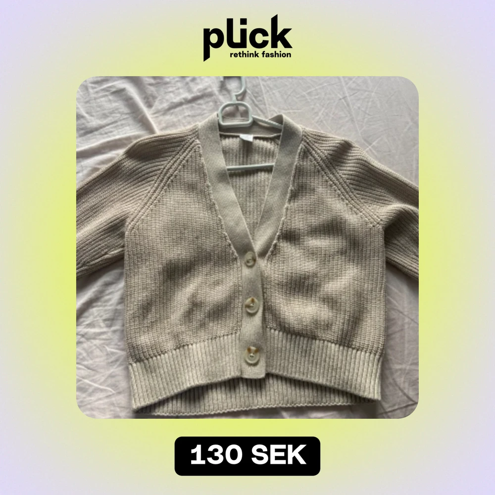 Säljer en superfin beige stickad kofta med stora knappar framtill. Den har en croppad stil och ribbade kanter som ger en snygg look. Perfekt för höst och vår när du vill ha något mysigt men ändå stilrent. Passar till både jeans och kjol!