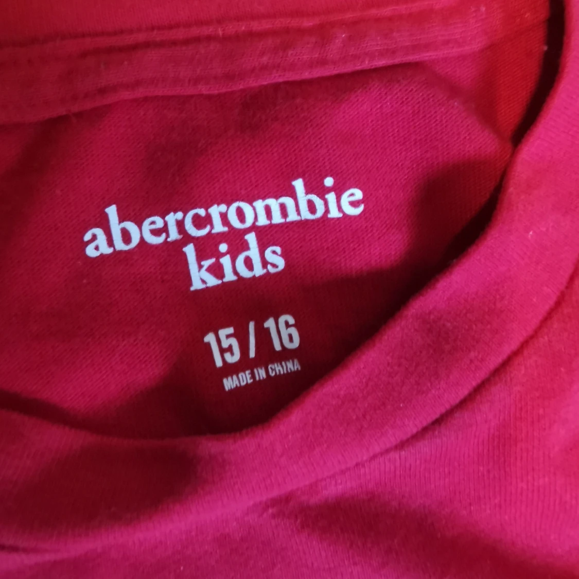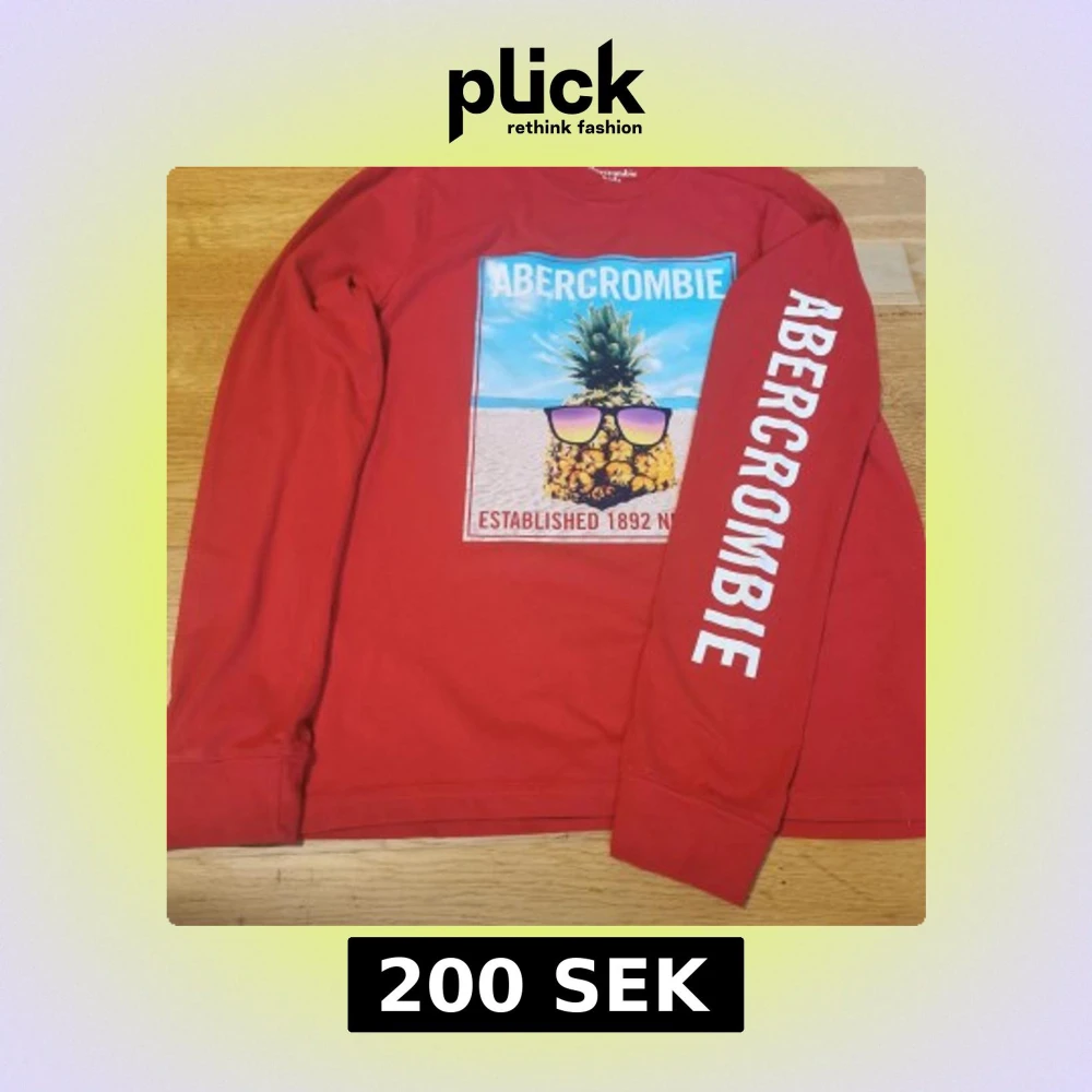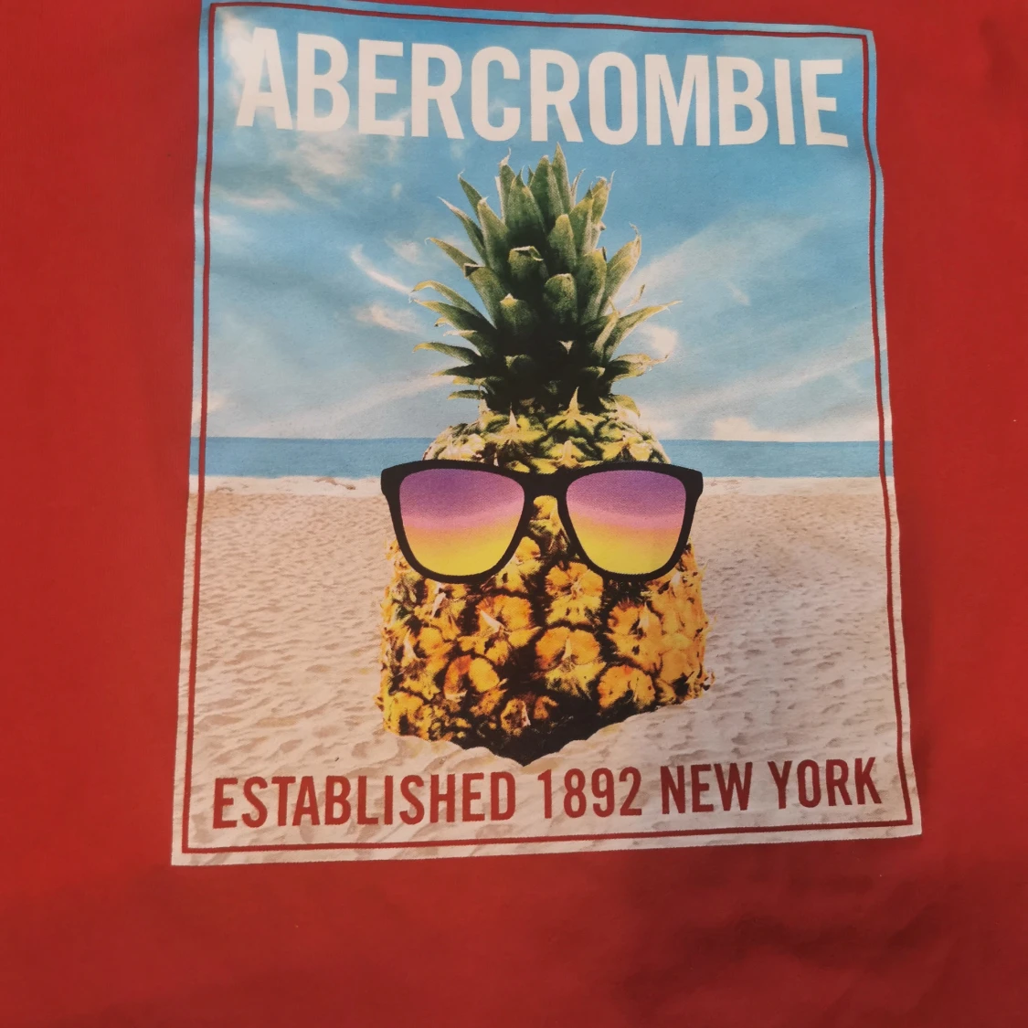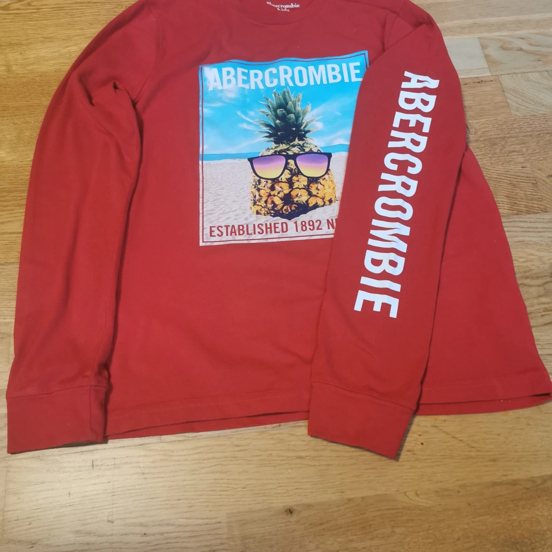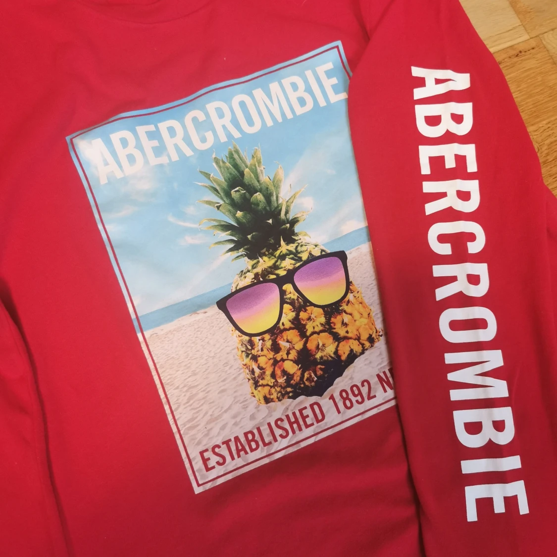 Snygg röd tröja från Abercrombie Kids med ett coolt ananastryck och texten 'Established 1892 New York'. Långärmad design med märkesnamnet tryckt längs ärmen. Perfekt för en avslappnad stil.