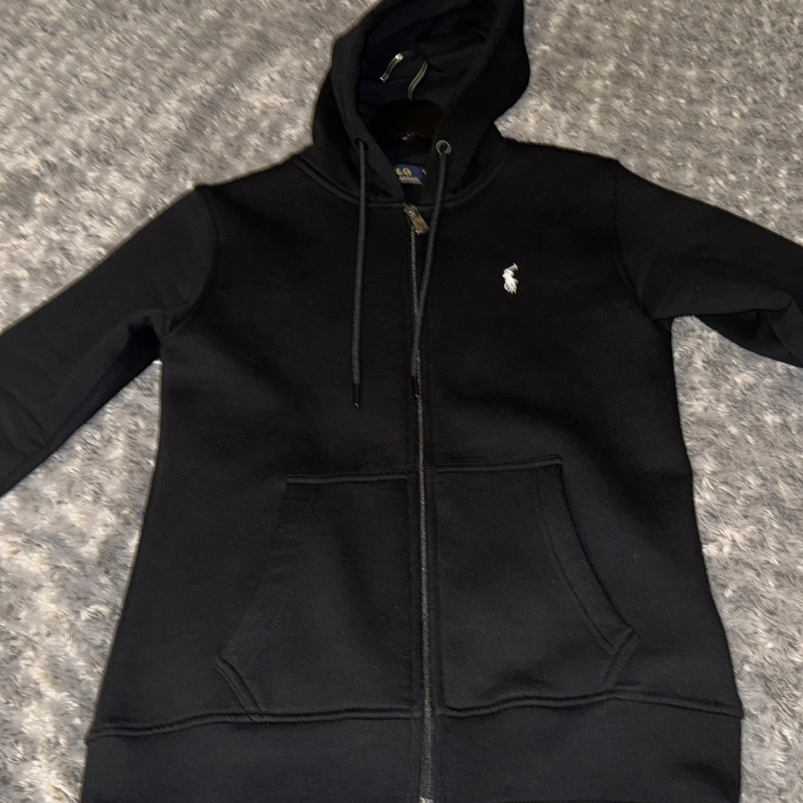 Svart hoodie från Polo Ralph Lauren med dragkedja, huva och snörning. Klassisk logga broderad på bröstet och två stora fickor framtill. Skön passform och perfekt för en chill look. Materialet är mjukt och känns riktigt nice knappt använt och bra pris. Pris kan diskuteras vid snabb affär