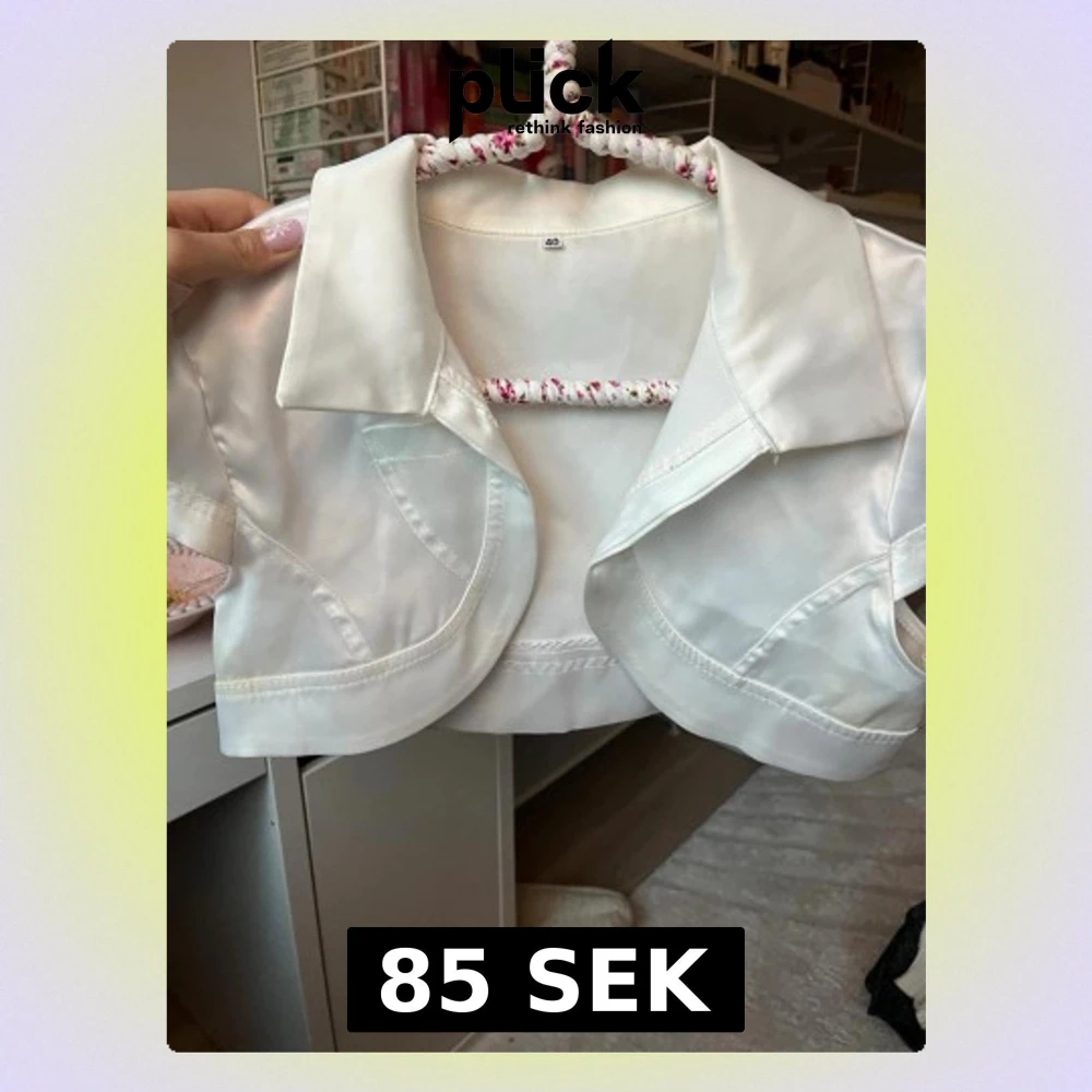 Säljer en vit bolero med korta ärmar och klassisk krage. Tillverkad i glansigt satinmaterial som ger en lyxig känsla. Perfekt att slänga över en klänning eller topp för en extra touch. Stilren och enkel design som passar till många looks. köpt på karlaplan loppis