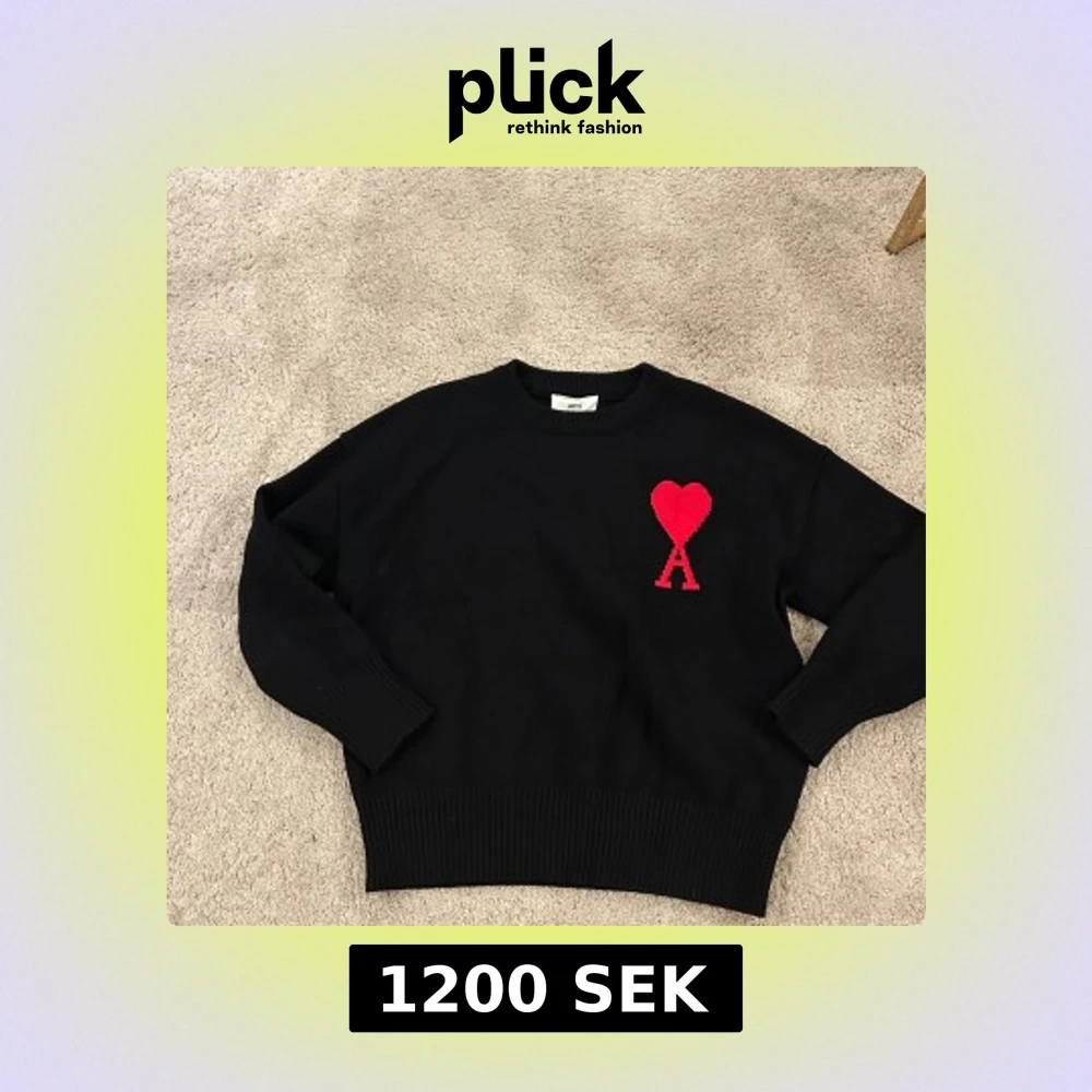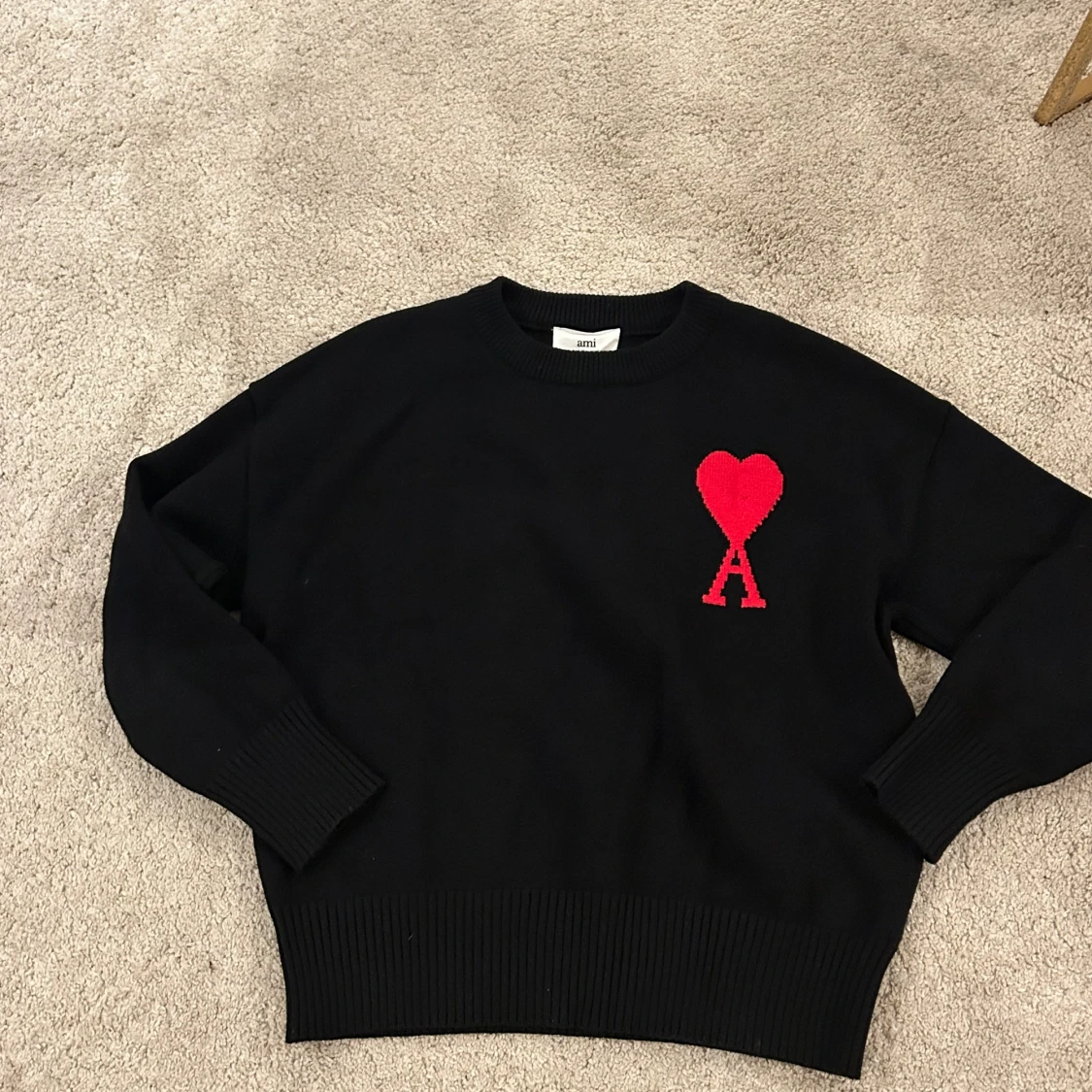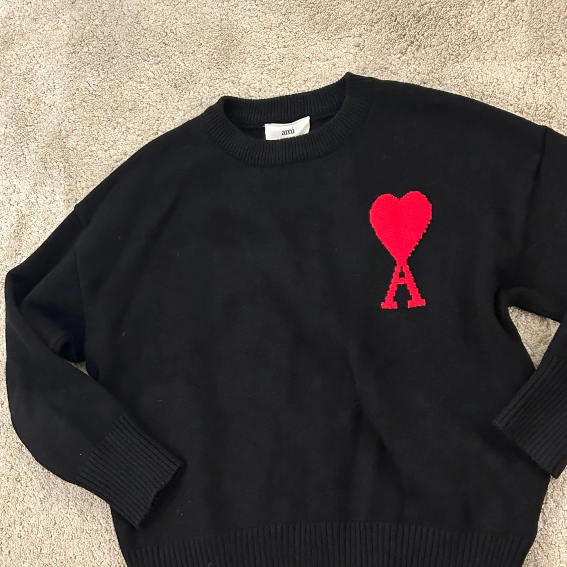 Snygg svart tröja från Ami med ett rött hjärta och bokstaven A på bröstet. Tröjan har långa ärmar och ribbade muddar vid ärmslut och nederkant. Perfekt för en stilren look.