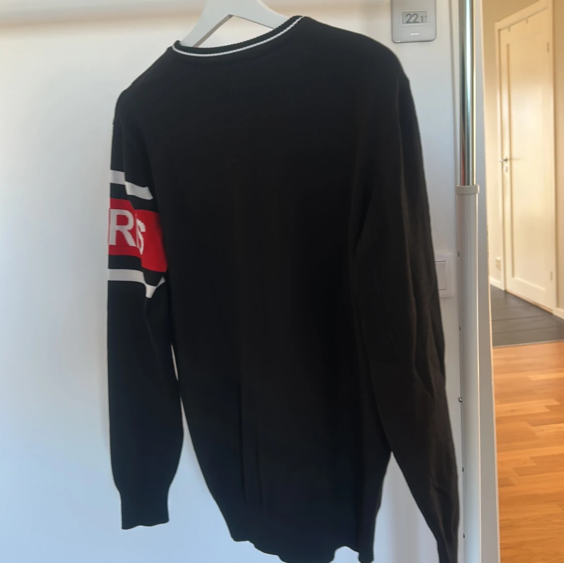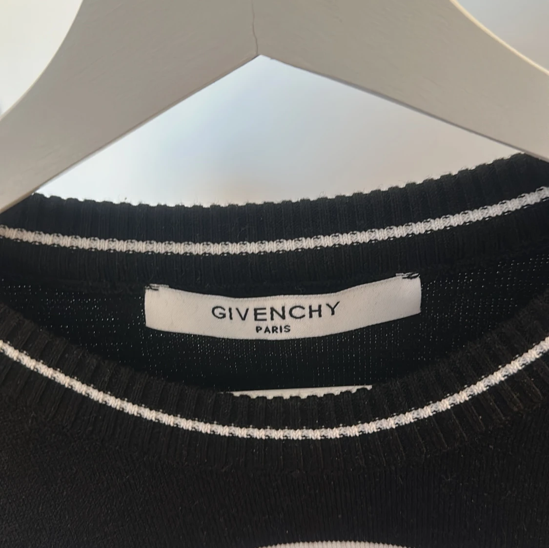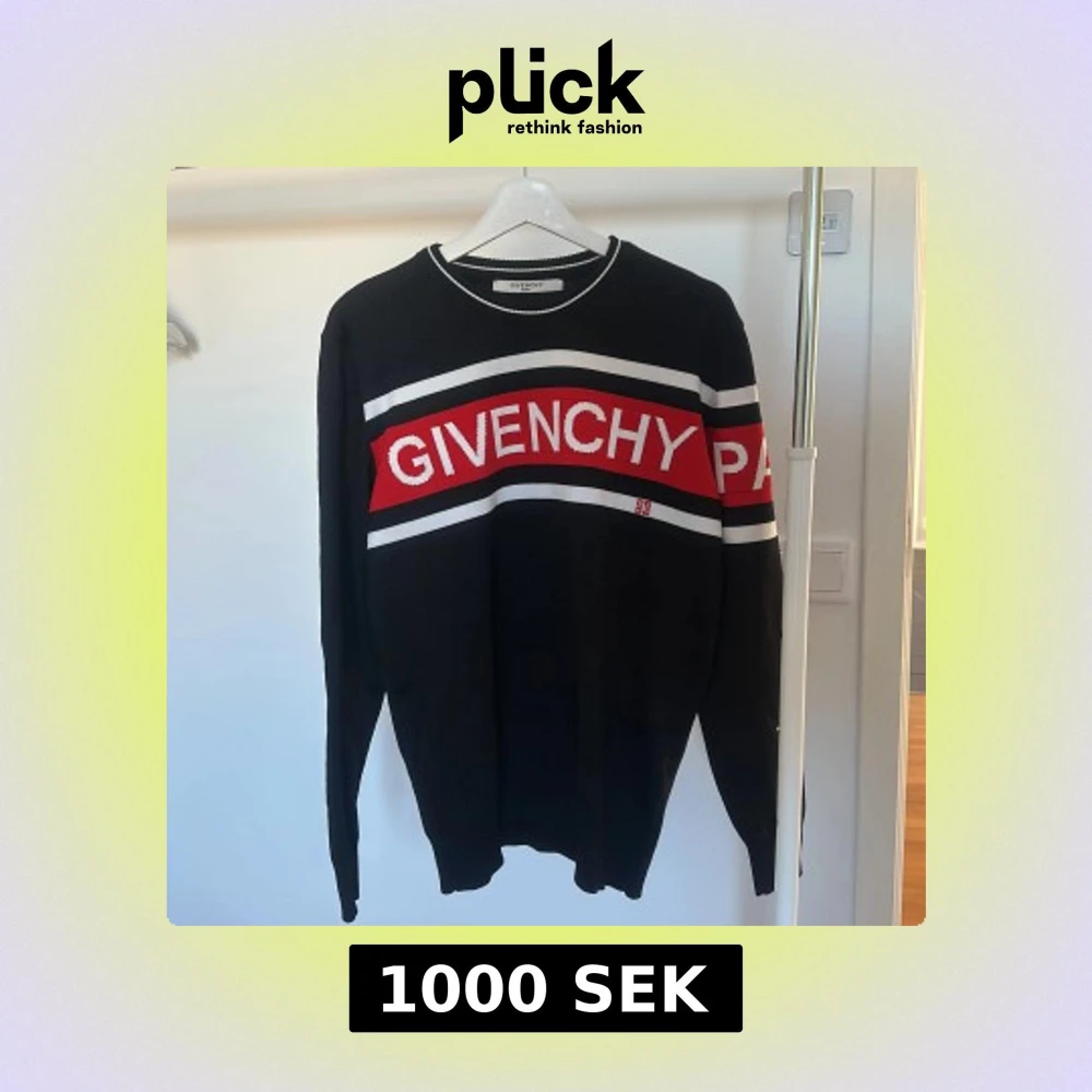 Snygg svart tröja från Givenchy med röd och vit text på bröstet. Tröjan har långa ärmar och en rund halsringning med vita detaljer. Perfekt för en stilren look. Mycket fint tyg. Fick den i present för några år sedan. Finns inget som tyder på storlek men skulle säga mellan m/xl.