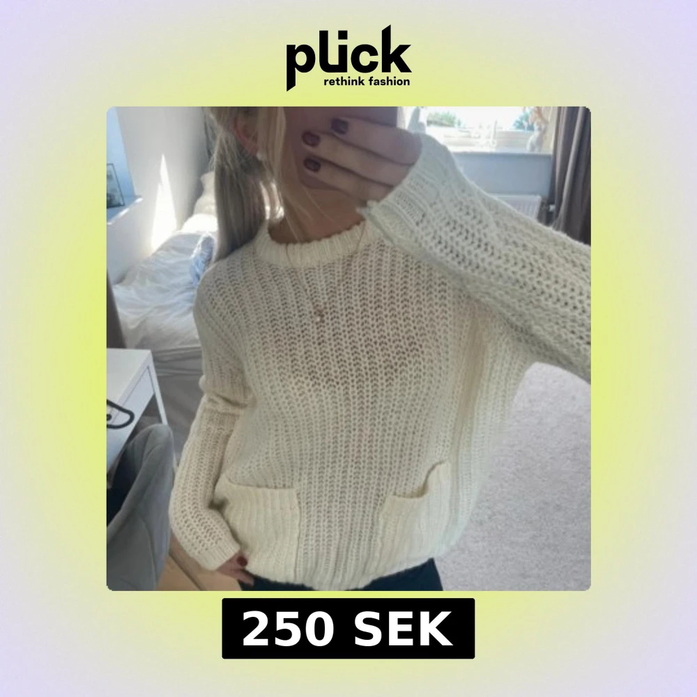 Mysig vit stickad tröja med två fickor framtill. Tröjan har en rund halsringning och långa ärmar, perfekt för kyligare dagar. Den har en avslappnad passform och är superenkel att styla till jeans eller kjol.