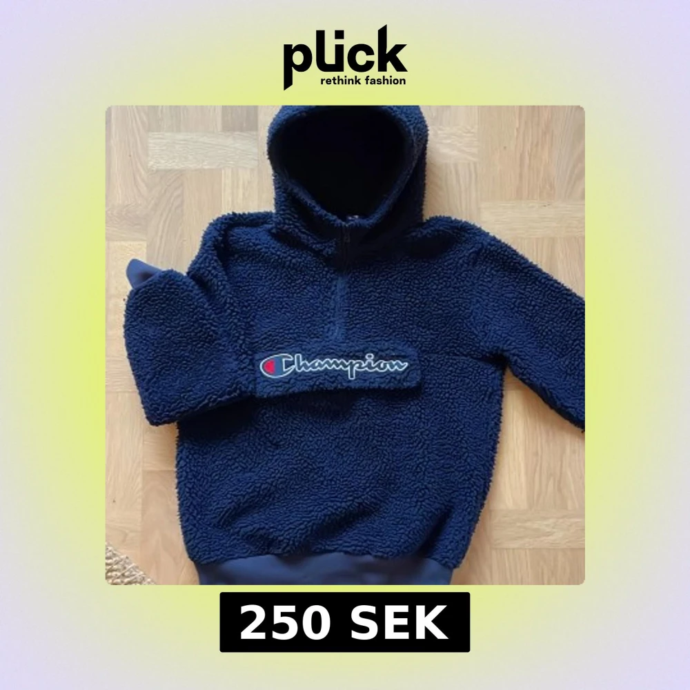 Mysig mörkblå hoodie från Champion i teddyfleece med stor broderad logga framtill. Tröjan har huva, half zip och långa ärmar med muddar. Perfekt för kalla dagar när du vill vara både varm och snygg. Praktisk ficka framtill.